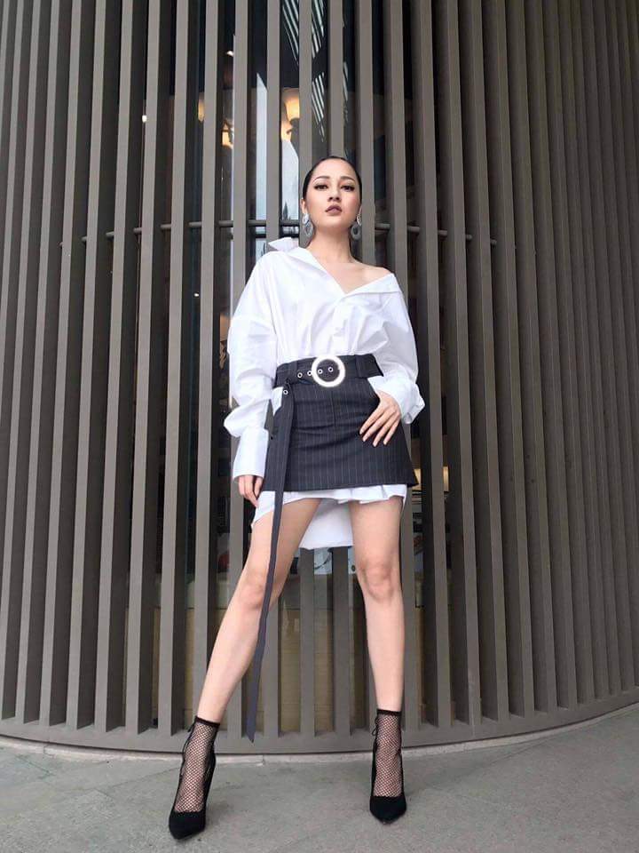 Cũng là sơmi trắng nhưng nữ ca sĩ lại phối chân váy sọc dọc, dây lưng dáng dài tạo điểm nhấn lạ mắt. Đặc biệt, chi tiết vai áo kéo trễ một bên bất đối xứng góp phần làm cho tổng thể trở nên thú vị.