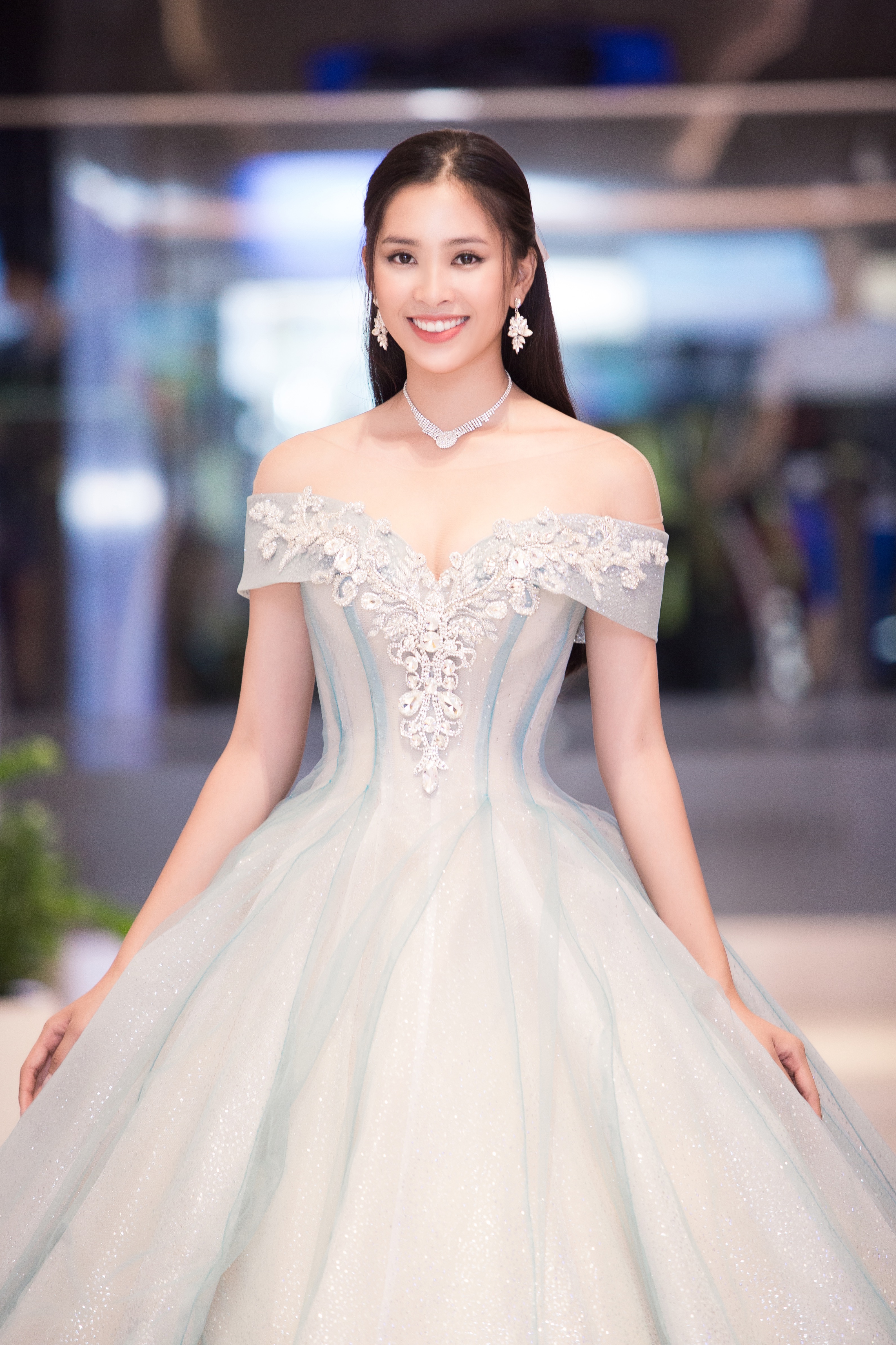 Chiếc đầm với thiết kế bồng xòe nhẹ giúp Tiểu Vy xinh đẹp như một nàng công chúa bước ra từ truyện cổ tích.