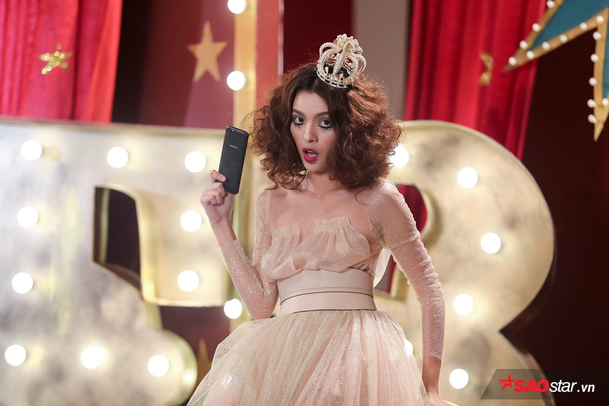 Diện trang phục cầu kì và đội vương miện, Tú Hảo với mái tóc xoăn xù, đôi mắt sắc lẹm như trở thành một nàng phù thủy xinh đẹp bước ra từ khu vườn cổ tích.