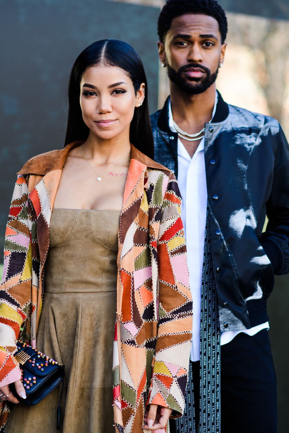Jhené Aiko - cô ca sĩ người Mỹ trong trang phục đầm màu da bò và áo khoát ngoài tạo nên sự sang trọng.