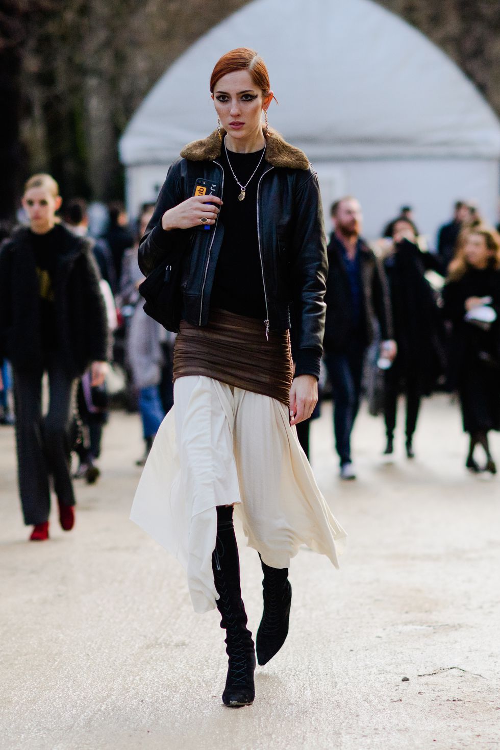 Sự kết hợp giữa đầm xuyên thấu và áo khoác da đã làm tổng thể thêm nổi bật.