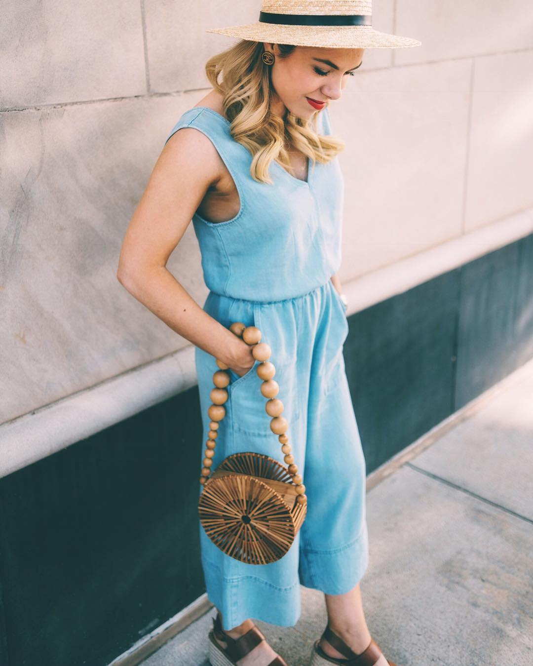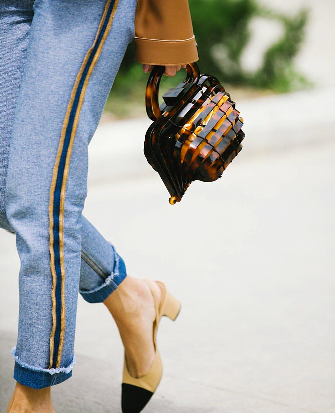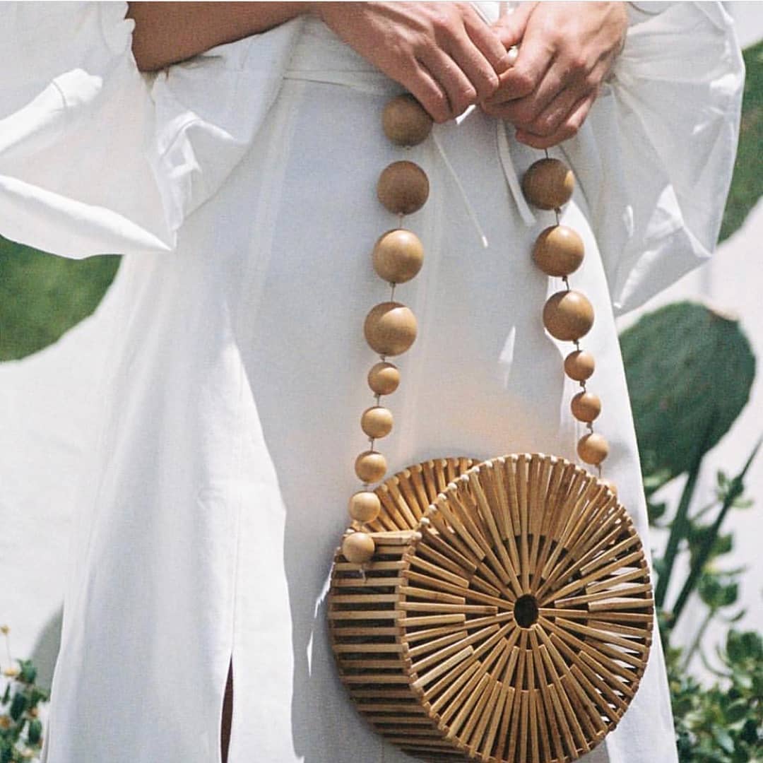 Dù không hot bằng dáng túi bán nguyệt, nhưng túi nan tre hình tròn cũng là một lựa chọn được nhiều quý cô ưu ái. Đây là một đối thủ đáng gờm với chiếc túi cói dạng hộp tròn đang làm mưa làm gió trong mùa hè năm nay.
