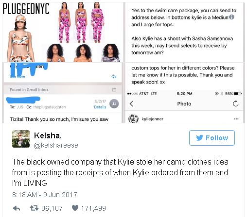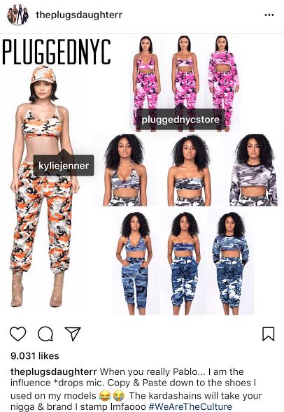 Sau khi instagram theplugsdaughter - một tài khoản khác của PluggedNYC chia sẻ bức hình kèm dòng trạng thái thẳng thắn cáo buộc Kylie sao chép y chang thiết kế của họ, còn tag cả tài khoản cá nhân của cô. Điều này cho thấy thương hiệu đang thực sự bất bình về hành động của Kylie.