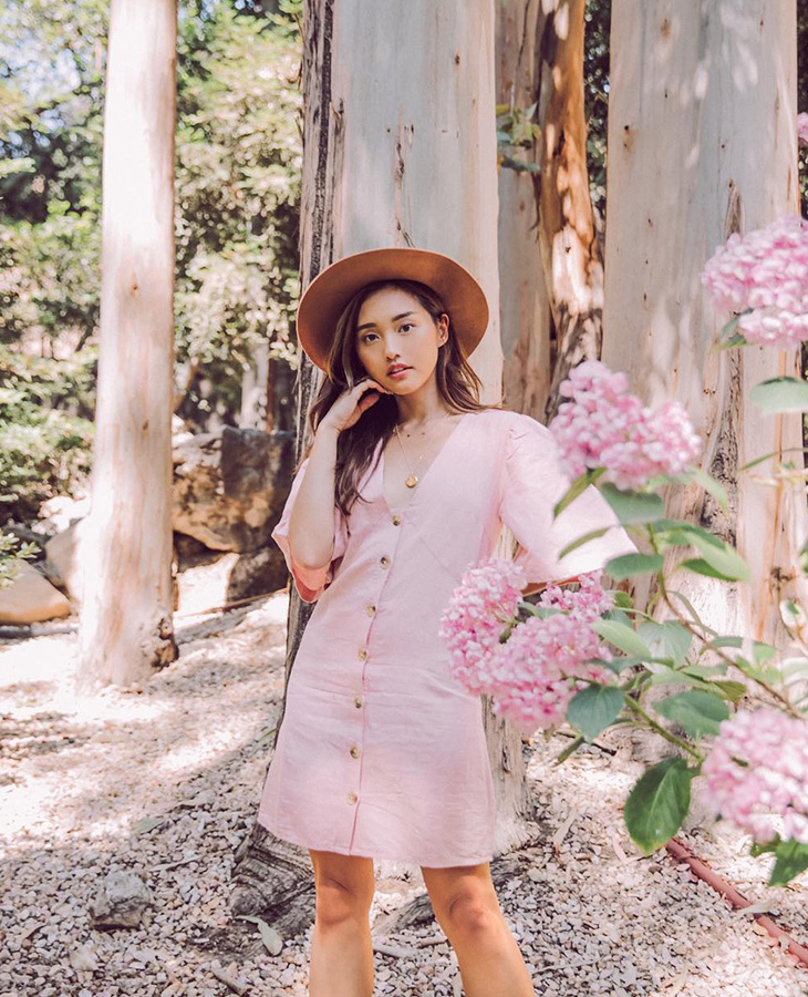 Beauty blogger Jenn Im đem đến set đồ theo phong cách đồng quê với chiếc đầm ngắn cài khuy màu hồng pastel và mũ rộng vành.