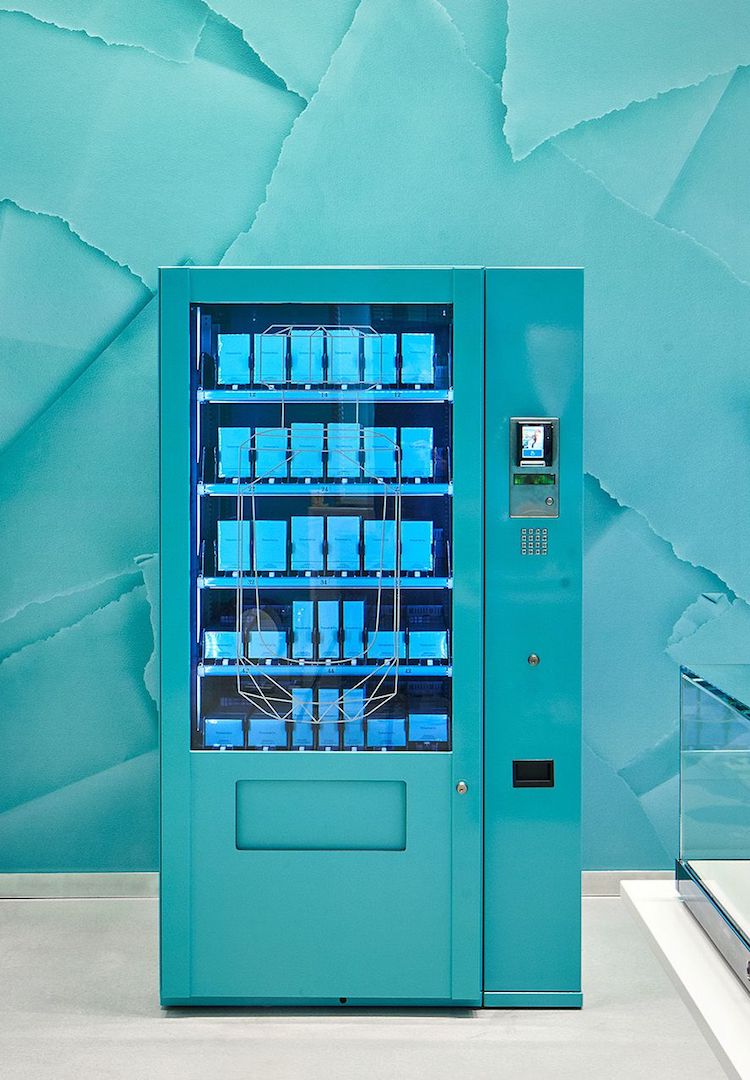 Máy bán hàng tự động màu xanh ngọc đặc trưng và được đặt ở cửa hàng mới mở của hãng ở London.