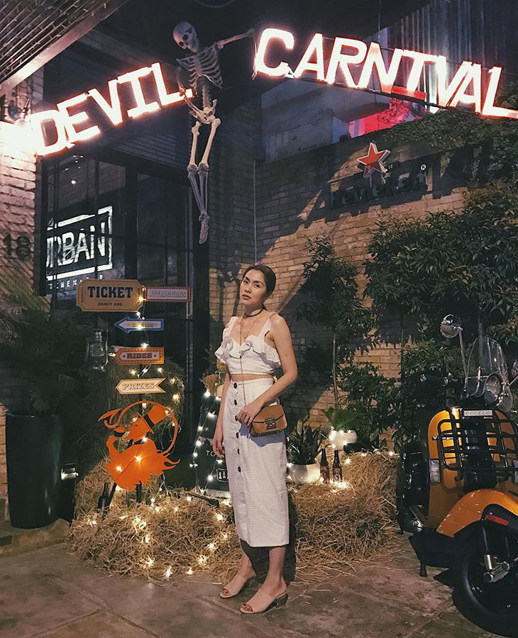 Không ngoại lệ, ngọc nữ Tăng Thanh Hà thể hiện được tinh thần tự do, phóng khoáng trong chân váy cài khuy trước.