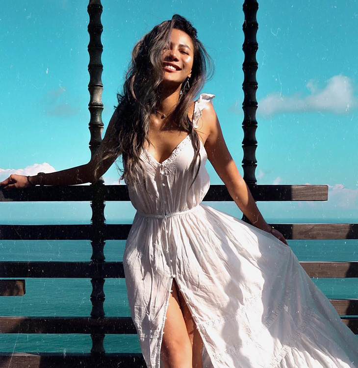 Beauty Blogger người Pháp Sananas phá cách chiếc đầm voan cài khuya với đôi boots cổ ngắn với thắt lưng bản to.