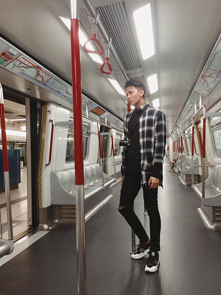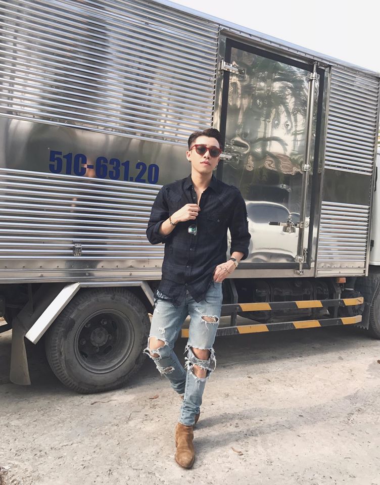 Stylist “phù thủy” Hoàng Ku tiên phong với kiểu áo “unfinished shirt” màu đen mix cùng quần denim rách và boots da lộn - một công thức kết hợp trang phục cơ bản và phổ biến.