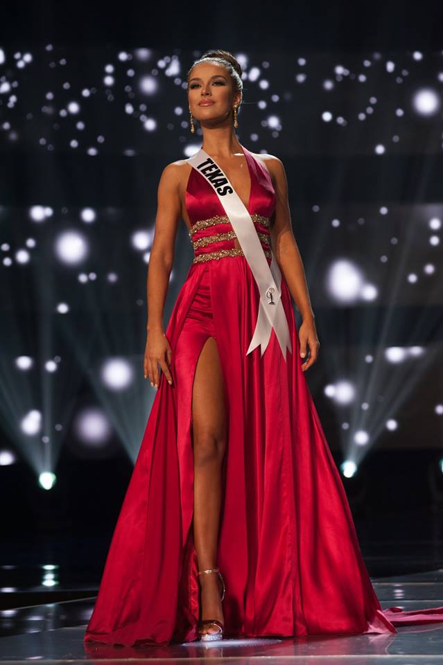 Đại diện Bang Texas ngọt ngào trong thiết kế xẻ đùi, tông đỏ quyến rũ. Cô hiện là thí sinh đang nhận được sự chú ý lớn từ người hâm mộ và là ứng cử viên sáng giá cho chiếc vương miện năm nay.