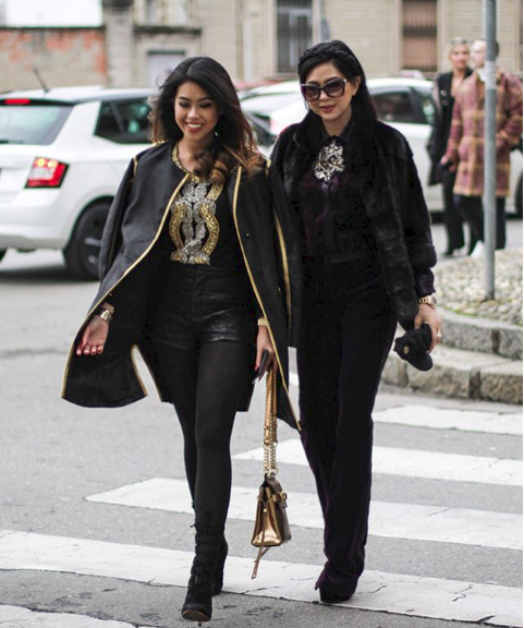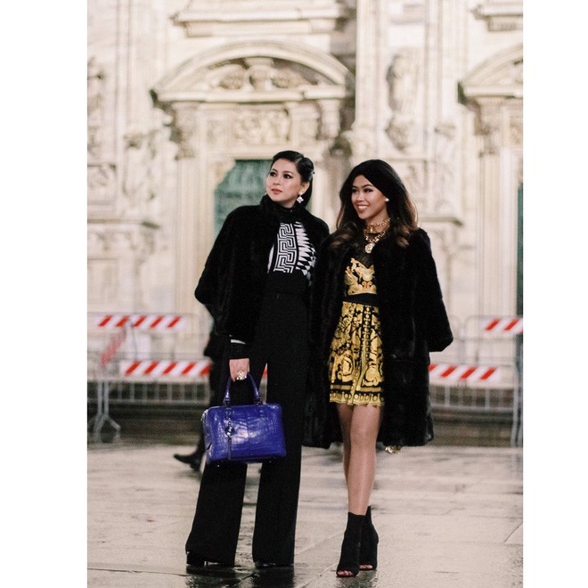 Tuy người diện váy, người mặc áo kiểu họa tiết cùng quần cạp cao ống suông, nhưng cả hai mẹ con doanh nhân đều khoác áo choàng đen đồng điệu.