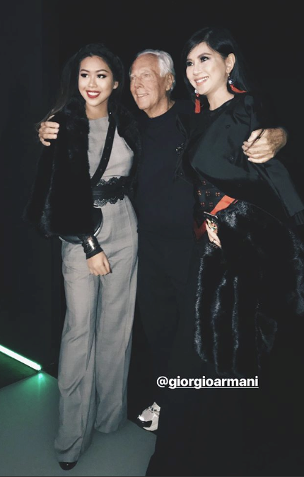 Áo khoác lông thời thượng phối cùng jumpsuit xám là trang phục cô nàng lựa chọn khi gặp NTK Giorgio Armani.