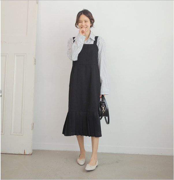 Váy yếm dài qua đầu gối cũng là item được ưa chuộng trong năm vừa rồi. Sắc nâu và đen là màu phổ biến nhất trên váy yếm. Áo phông, áo len mỏng hay sơ mi được mặc bên trong, kết hợp ngoài là váy yếm hai dây là công thức hoàn hảo, trọn vẹn, giúp các nàng ăn gian chiều cao, che đi vòng hai bánh mì.