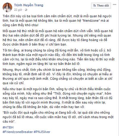 Trong khi đó, nhà văn Huyền Trang cho rằng trên đời này có ba loại tình cảm nên chấm dứt, một là mối quan hệ người tình, hai là mối quan hệ không tên, ba là mối quan hệ “friendzone”.