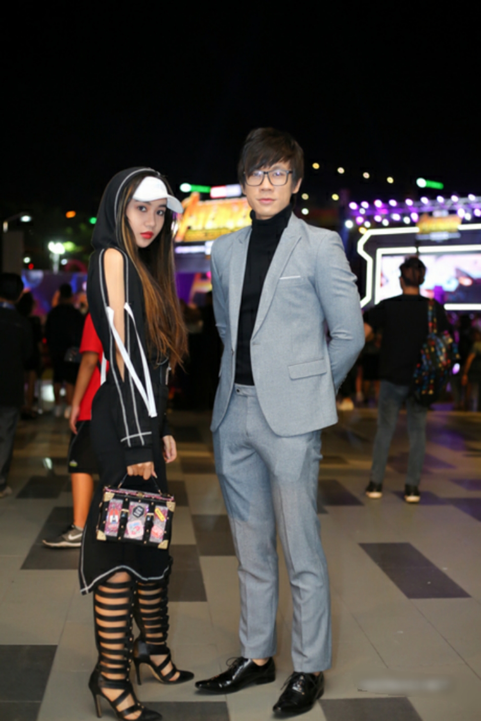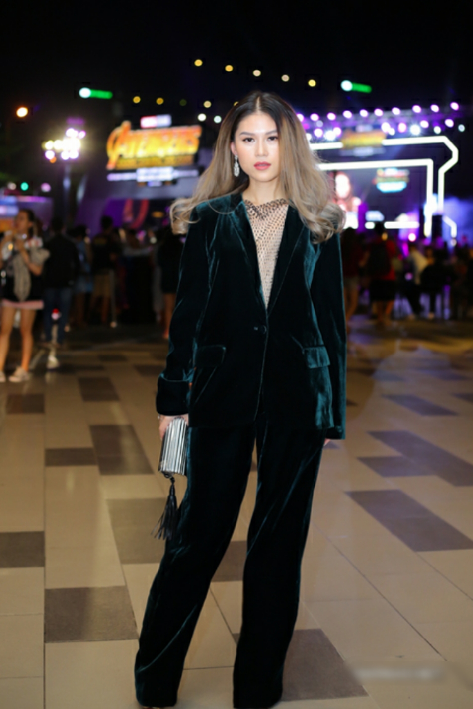 Chất liệu nhung - mốt, cách diện vest không nội y - cũng mốt, nhưng hoàn toàn không phải được mặc theo cách của Ngọc Thanh Tâm, trông cô nàng như bị nuốt chửng bởi trang phục quá rộng cũng như bị cộng thêm tuổi bởi cách lựa chọn tông màu quá già.