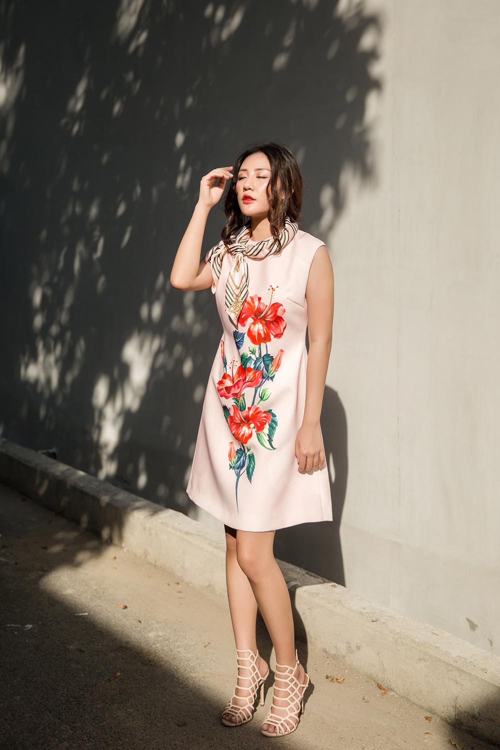 Lúc thì nhấn nhá chiếc khăn lụa tạo điểm nhấn cho phần cổ thiết kế đơn giản của trang phục.