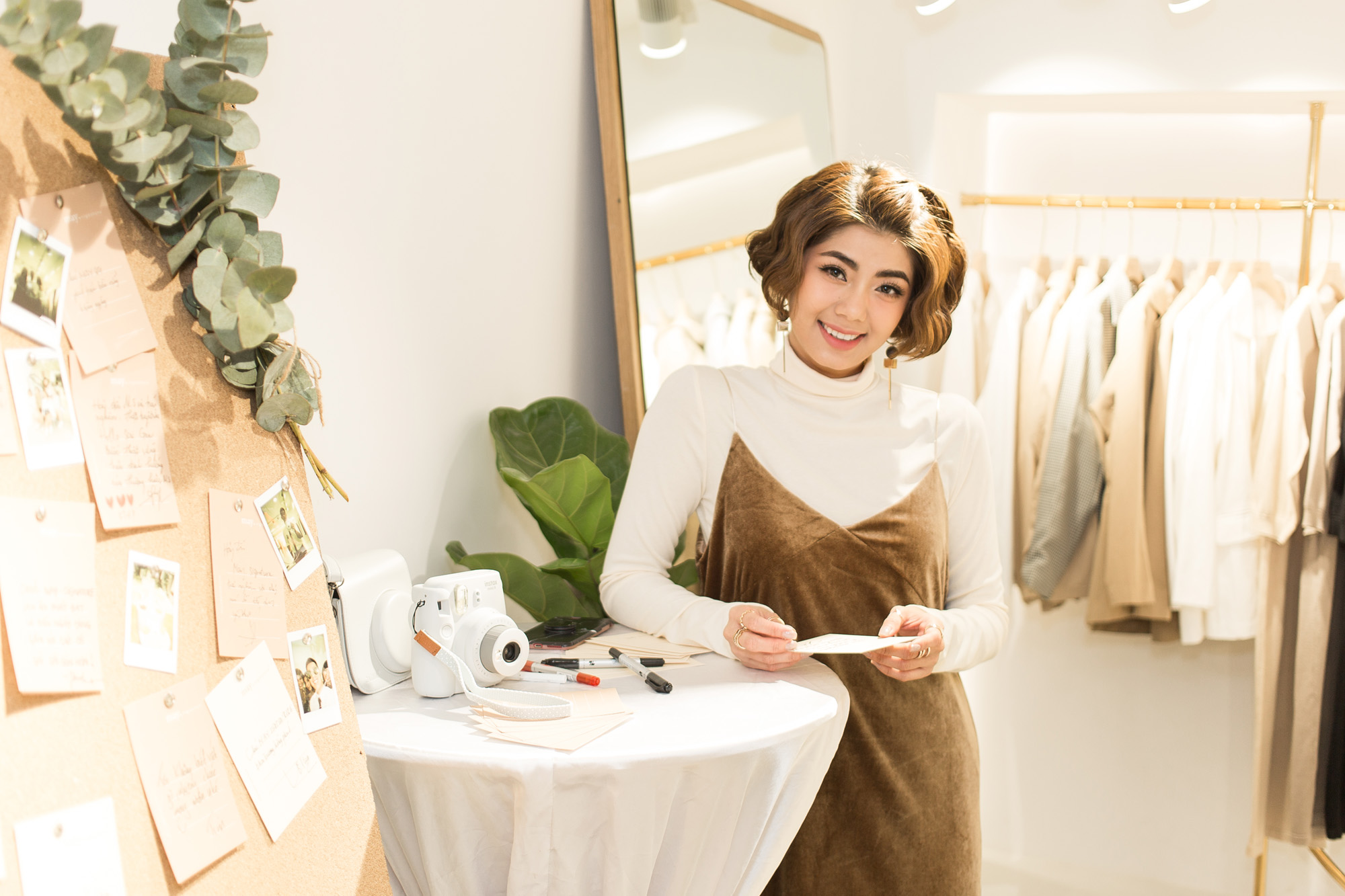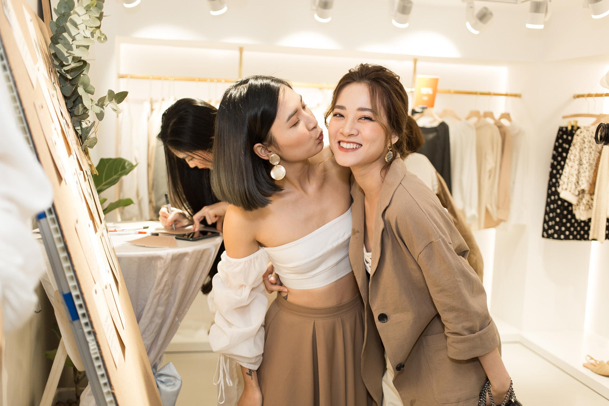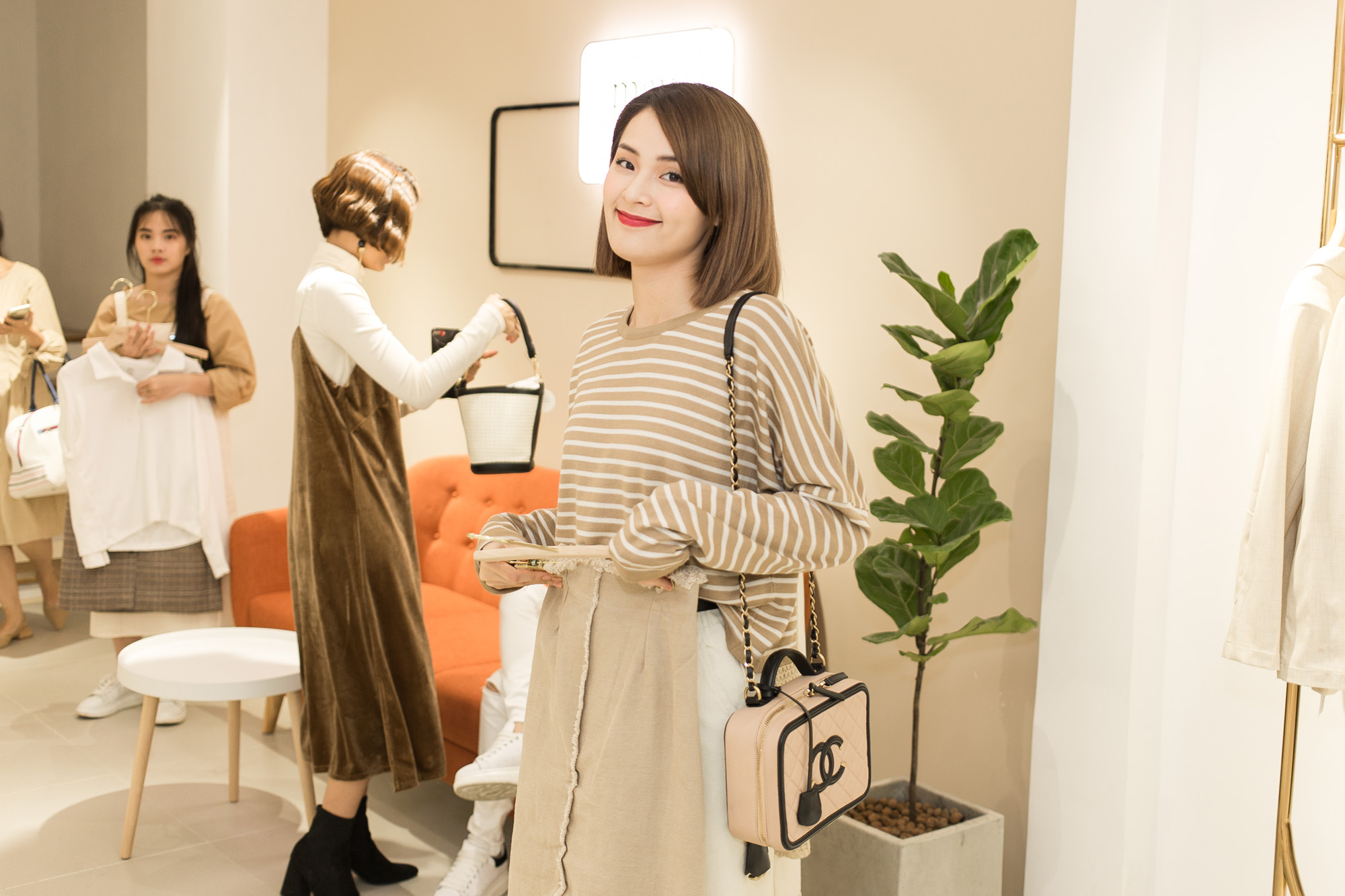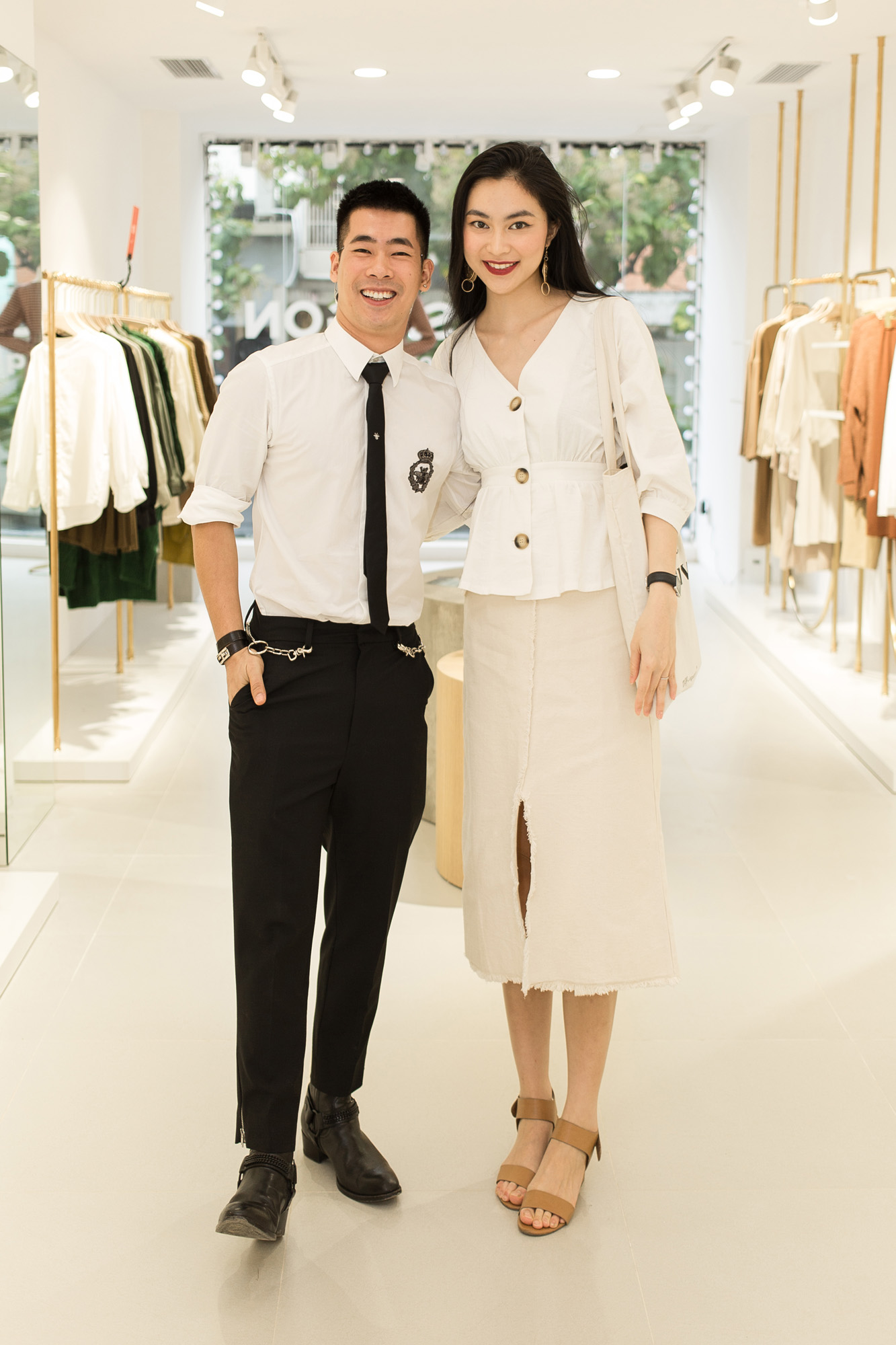 Helly Tống giản dị với set đồ trắng kem đến mừng người anh stylist Travis Nguyễn lên chức ông chủ.