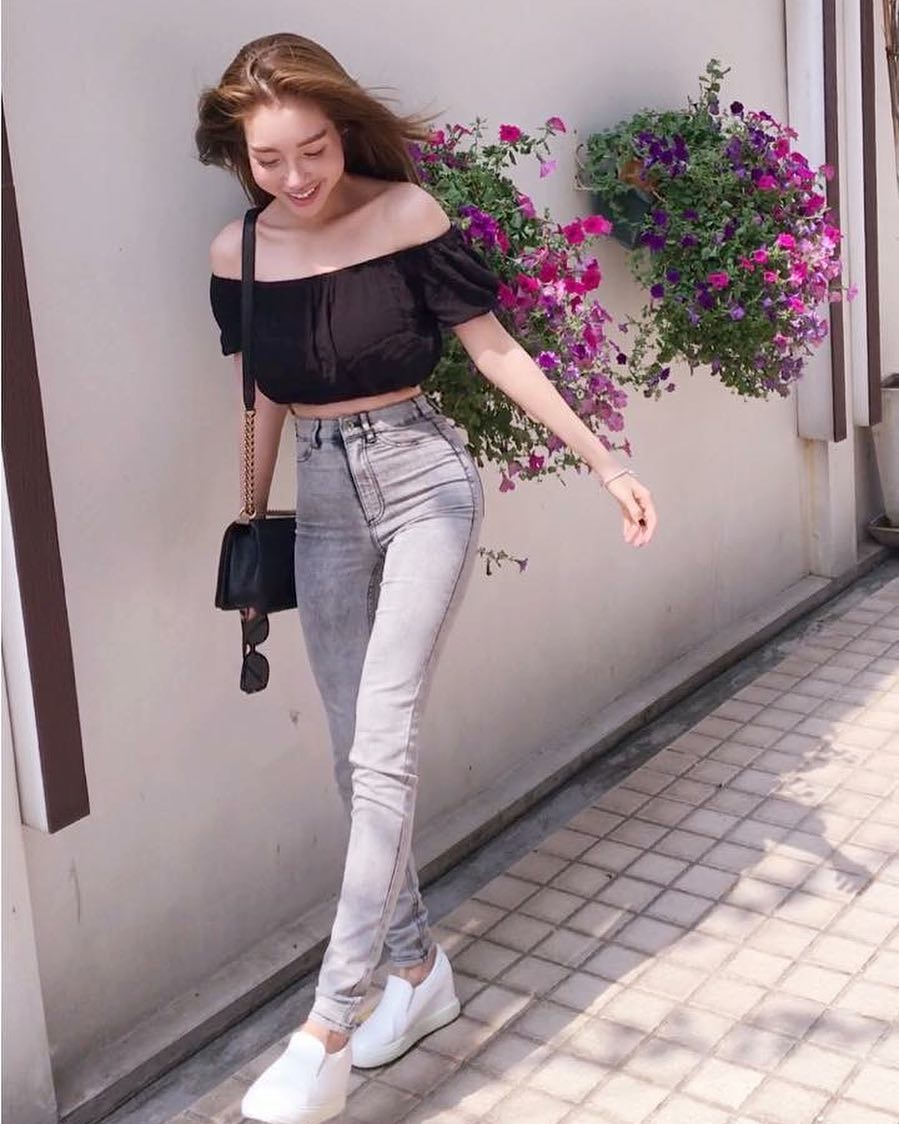 Áo croptop tối màu thường được nàng phối với quần jeans cạp cao ôm sát, giúp khoe đôi chân dài và vòng 3 nóng bỏng.
