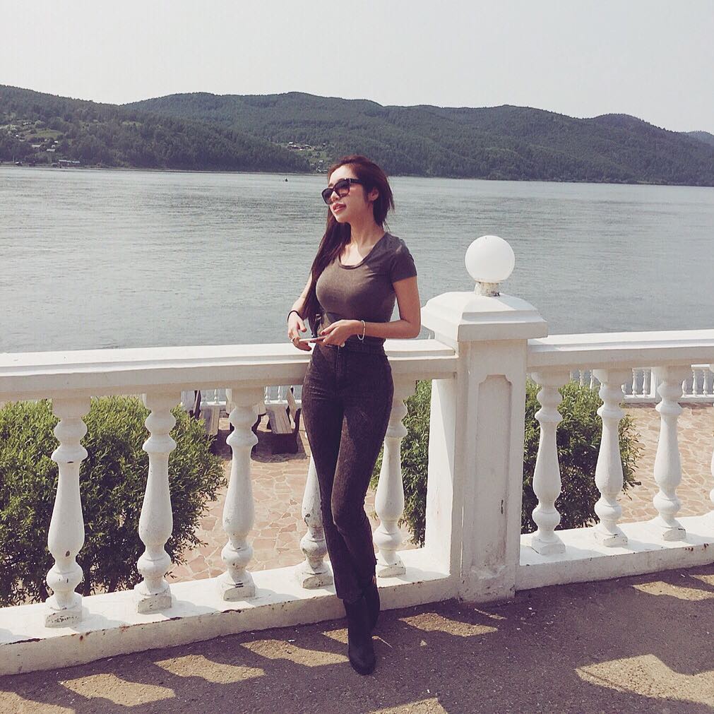 Elle Trần là một trong những fan trung thành của áo croptop. Nàng thường chọn những màu áo tối có thể che vòng 1 nở nang vừa có thể khoe vòng 2 nhỏ gọn.