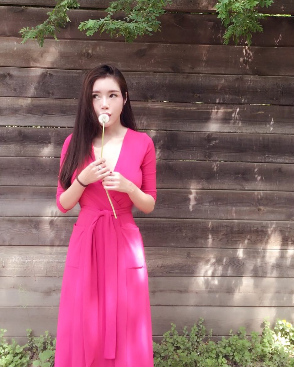 Chiếc đầm hồng với đường xẻ ngực nhẹ nhàng có tác dụng đánh lừa ánh mắt người nhìn, trông vòng 1 có vẻ gọn hơn nhưng chính đường xẻ ngực khoe khéo khuôn ngực đầy đặn.