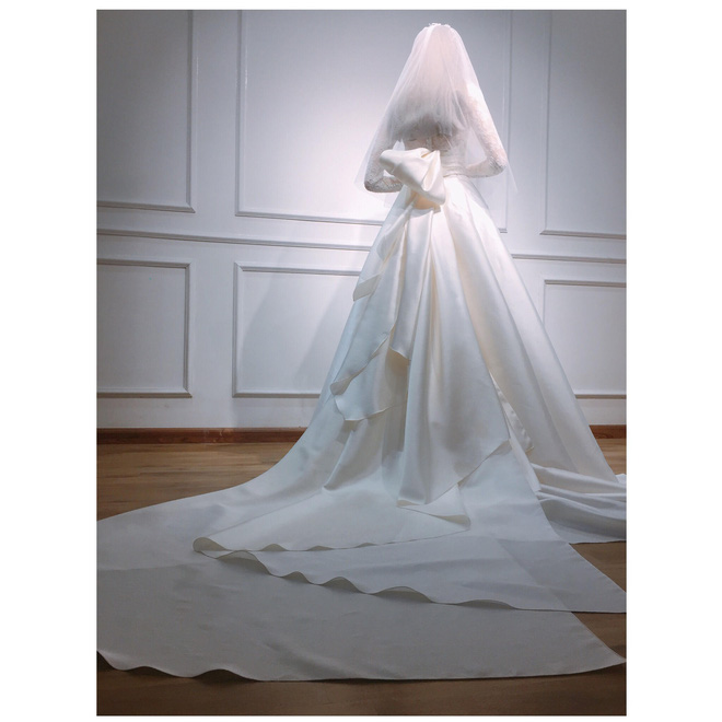Phía sau váy cưới của Thu Thảo là tùng váy bồng bềnh và dài. NTK Lê Thanh Hòa đã dùng kỹ thuật xếp lớp 3D nhằm tạo hiệu ứng váy phồng nhưng vẫn đảm bảo độ mềm mại, uyển chuyển cho người mặc.