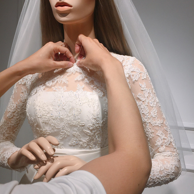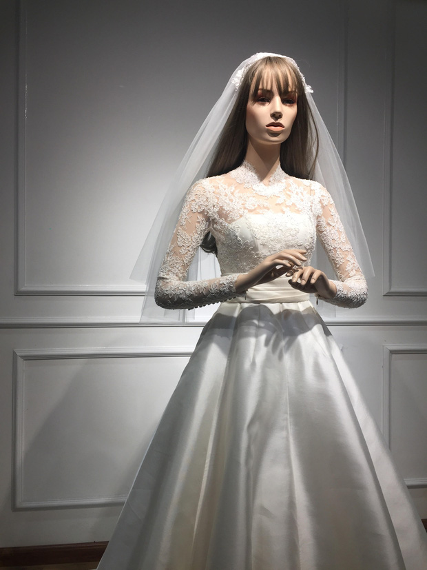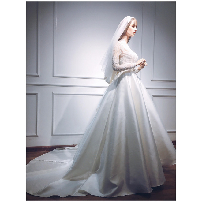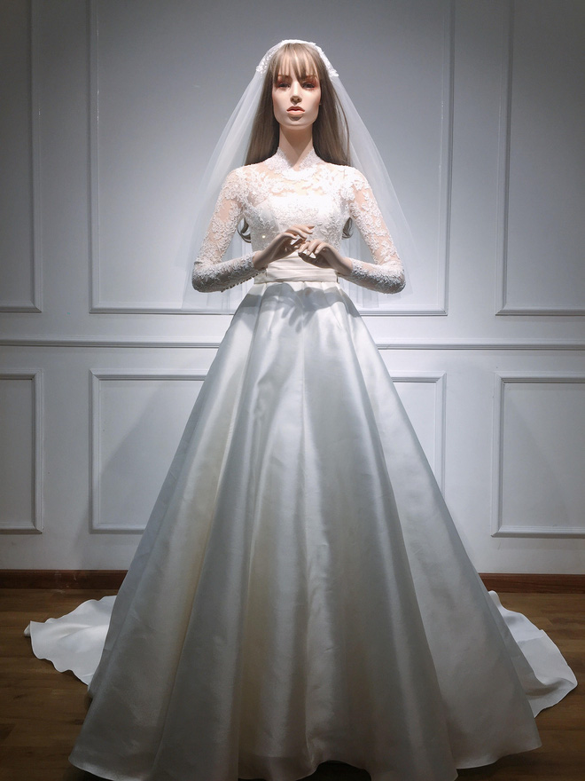 Thiết kế với phần voan nhẹ nhàng phủ kín từ cổ xuống cánh tay khá kín đáo nhưng vẫn giúp cô dâu khoe được vẻ đẹp hình thể.