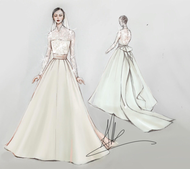 Thiết kế thứ hai được nhà thiết kế thân thiết Lê Thanh Hoà dành tặng cho Đặng Thu Thảo. Khác với vẻ nữ tính của bộ váy đầu tiên, váy cưới của tiệc chính mang hơi hướng cổ điển với phần tay áo ren dài. Khoăn voan cài tóc cô dâu cũng theo chủ đạo màu trắng.