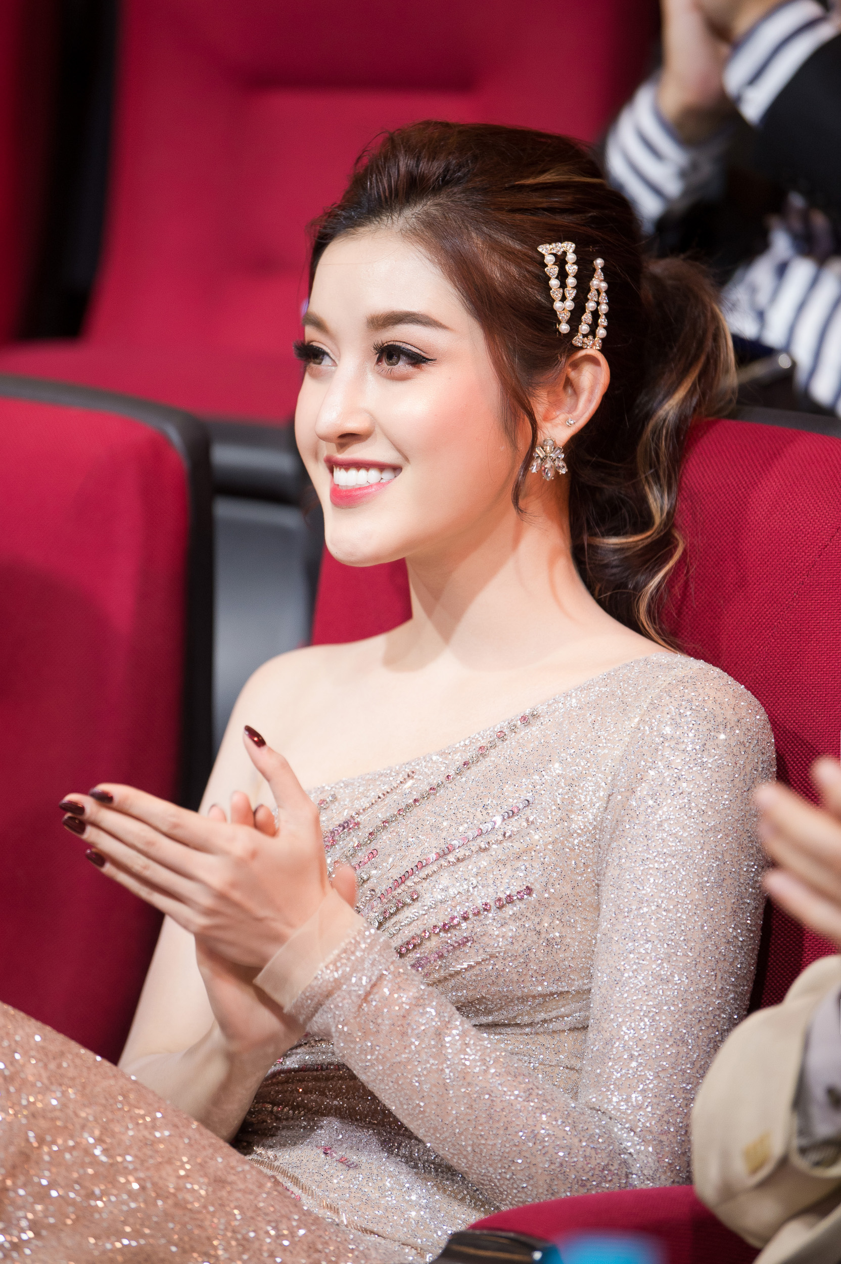 Đảm nhận vai trò giám khảo, Huyền My vô cùng lộng lẫy với bộ váy ánh bạc lấp lánh, kiểu dáng lệch vai của NTK Đỗ Long. Để hoàn hảo hơn về vóc dáng, cô không ngại sử dụng đôi giày cao 20cm.
