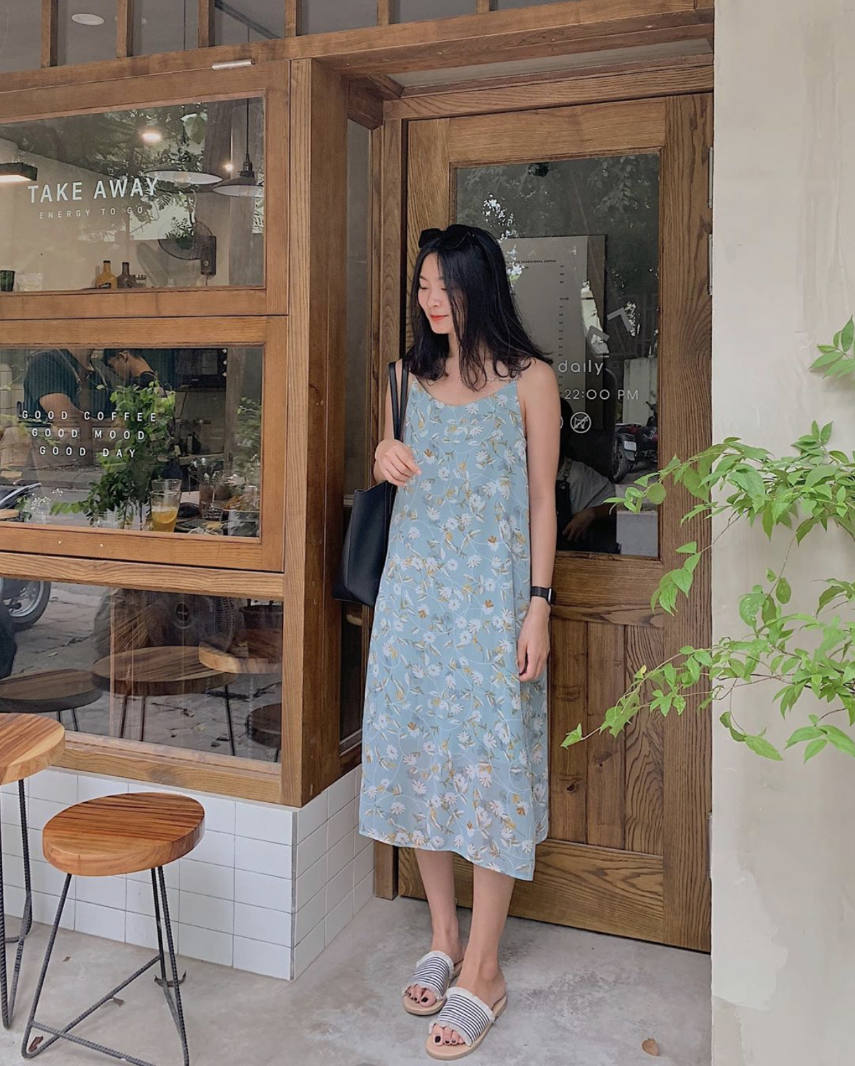 Hay là váy xanh hoạ tiết xinh xắn như thế này! Chào thu thật đơn giản phải không cả nhà? (Ảnh: ig @nhameo_)