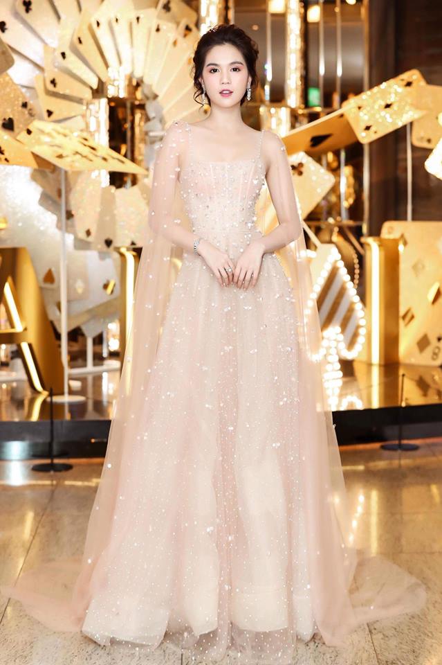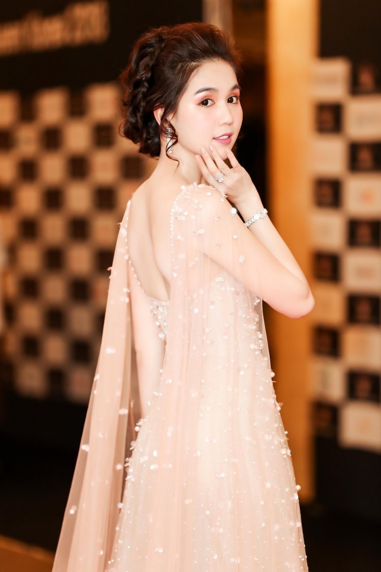 Bộ cánh giúp người đẹp khoe nhan sắc trong trẻo. Vốn yêu thích sự nữ tính, lộng lẫy nên Ngọc Trinh tạo điểm nhấn bằng cách thêm phần vạt áo dài quét cả đất. Nếu đã chọn một chiếc váy công chúa như thế này thì đừng quên tạo một kiểu tóc hài hòa như Ngọc Trinh.