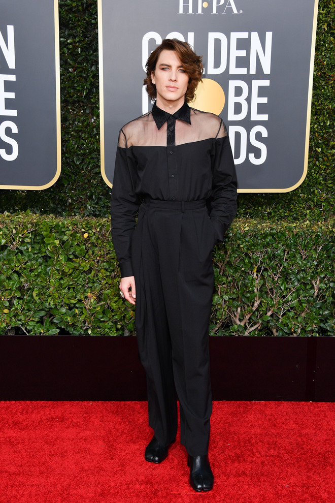 Nam diễn viên Cody Fern là một trong những số ít sao nam mang đến vẻ khác biệt trên thảm đỏ. Anh gây ấn tượng với set đồ tông đen đơn giản với chiếc áo somi vải voan mỏng tanh đi kèm đôi boots cao gót đen của Maison Margiela.