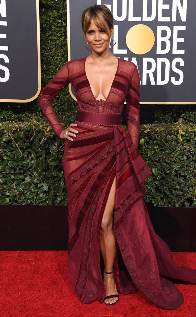 Halle Berry diện váy Zuhair Murad màu đỏ đô , cắt xẻ xuyên thấu táo bạo kết hợp đi giày của hiệu Loriblu