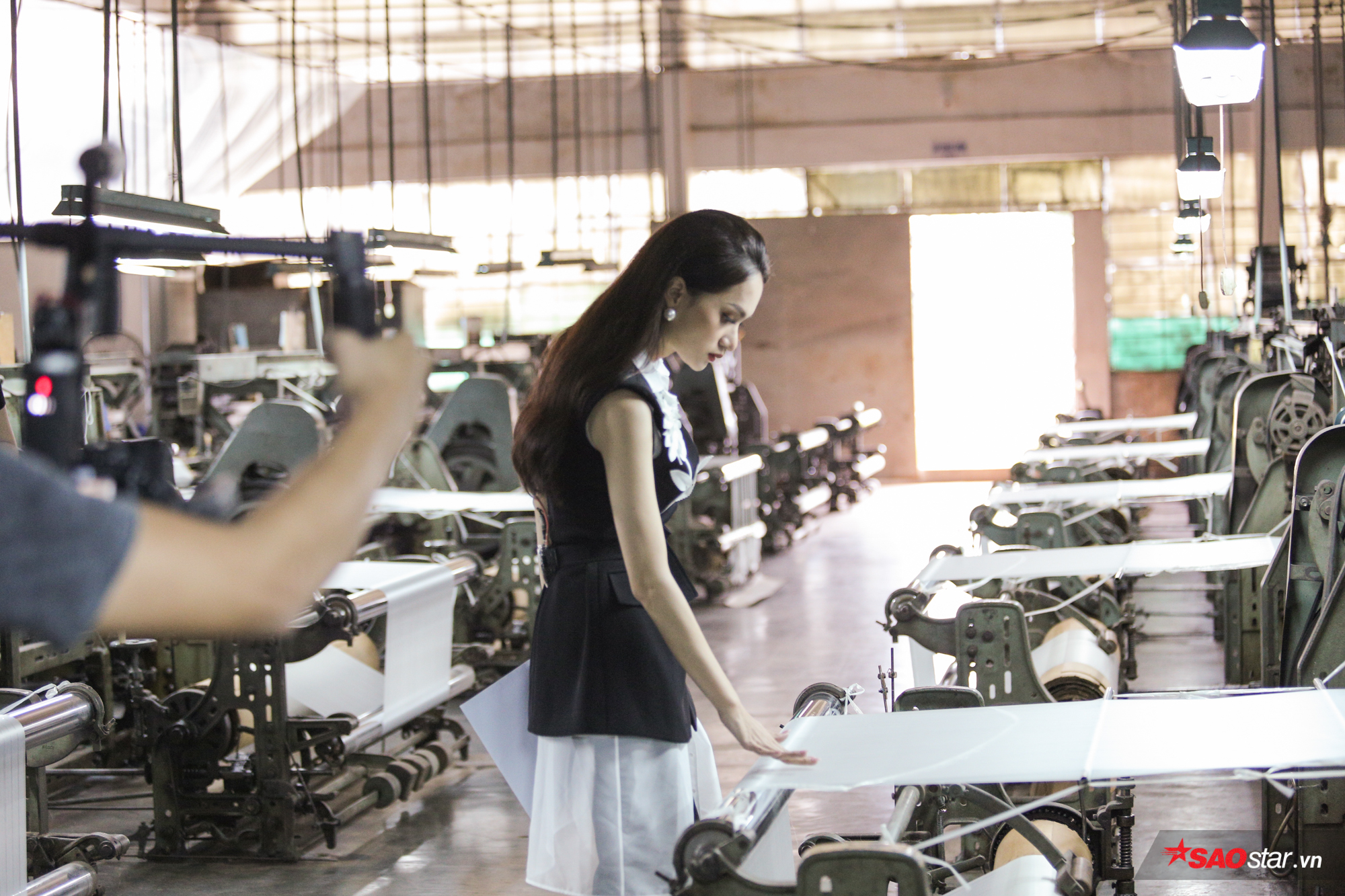 HLV Kỳ Duyên đi từng ngóc ngách trong nhà máy lụa Bảo Lộc để chọn góc chụp đẹp nhất