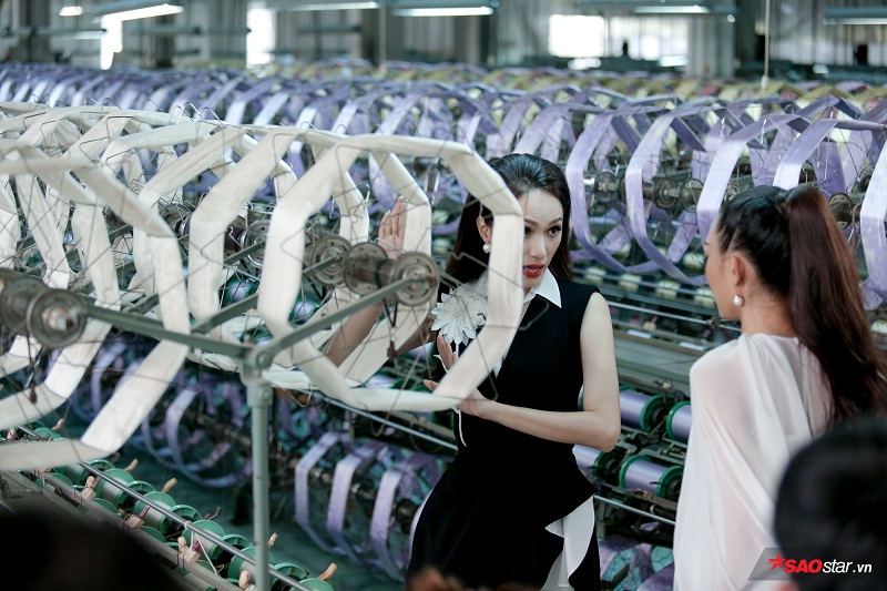 Hương Giang đang hướng dẫn cho các thí sinh của mình chụp hình bên cạnh các máy quay tơ lụa một cách cẩn thận nhất.
