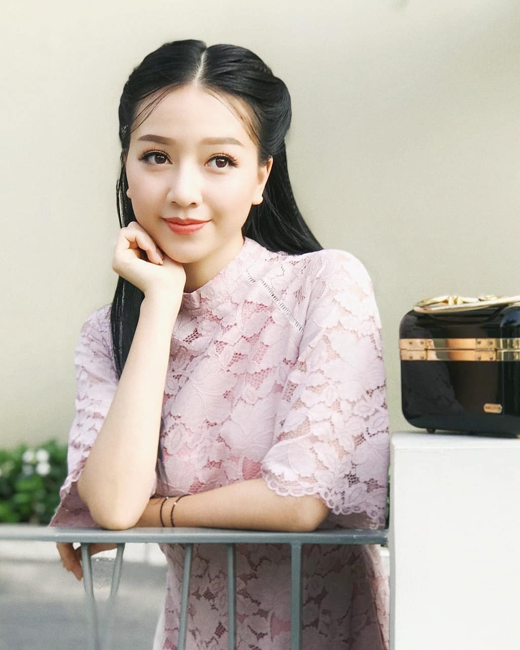 Xinh đẹp, ngọt ngào với áo dài phối ren và tóc đen truyền thống.
