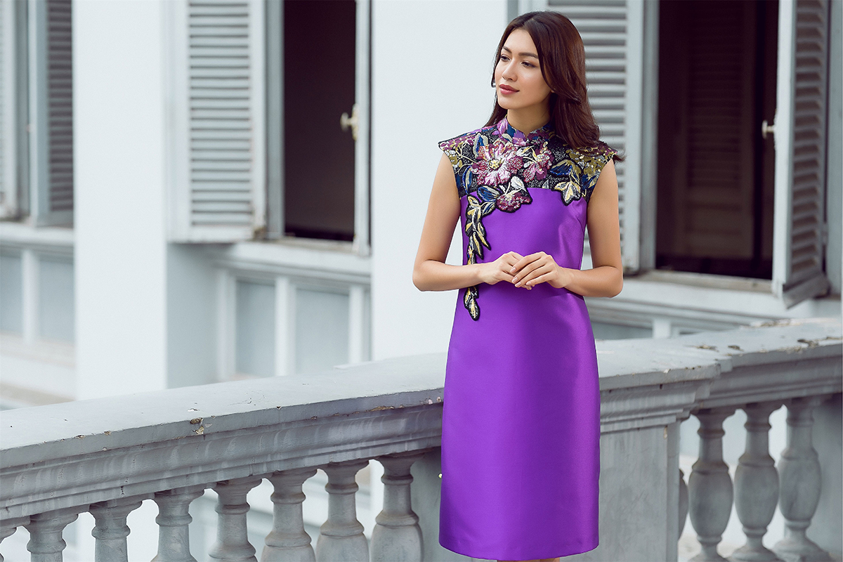 Một trong những thiết kế có phom đầm cổ điển với phần thân áo chất liệu gấm hoạ tiết gắn kết ăn ý cùng thân váy vải gấm tafta gam màu tím bắt mắt.