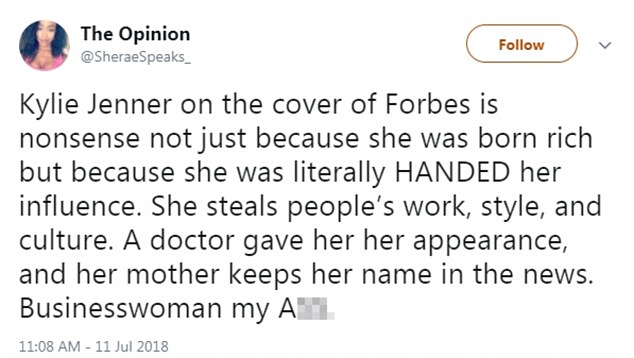 Sau khi bài phỏng vấn của cô với Forbes được đăng tải, đa phần báo chí Mỹ và cư dân mạng xã hội đều cho rằng Kylie Jenner không xứng đáng với danh hiệu này và cho rằng cô đã có hậu thuẫn quá hùng hậu từ tên tuổi của gia đình.