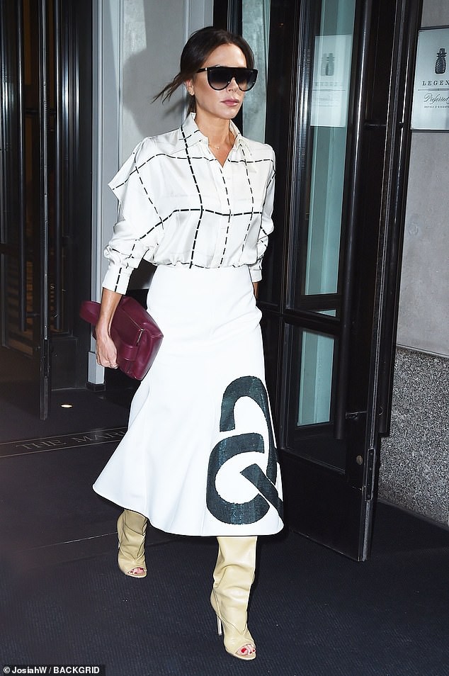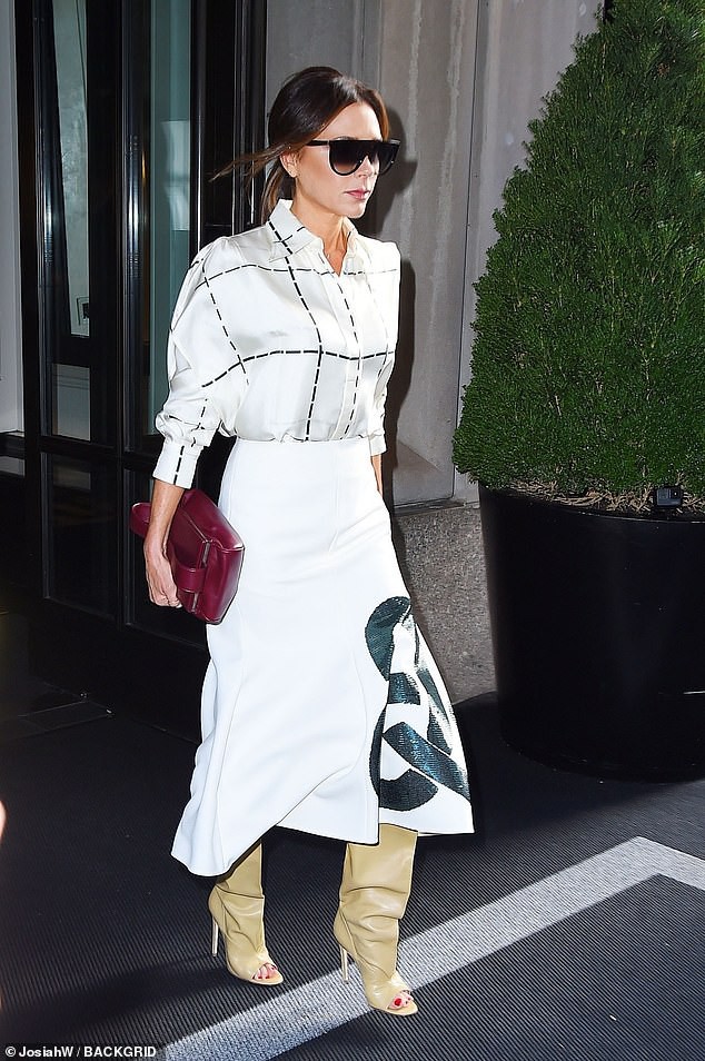 NTK Anh Quốc Victoria Beckham chọn cho mình áo sơ mi sọc caro và chân đầm midi trắng họa tiết 3D nổi do chính cô thiết kế.