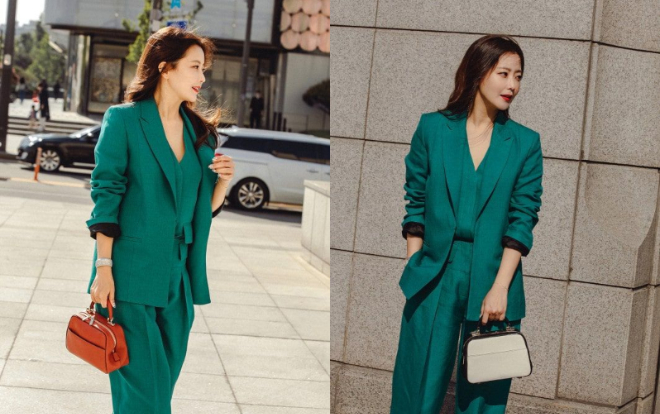 “Đệ nhất mỹ nhân xứ Hàn” Kim Hee Sun trẻ trung trong dáng suit màu xanh ngọc bích oversized