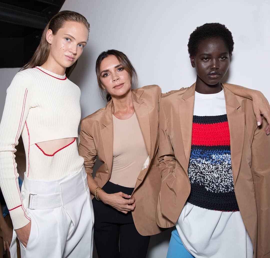 Victoria Beckham chụp hình cùng với dàn mẫu của mình sau cánh gà, đây là lần đầu tiên cô ra mắt bộ sưu tập của mình tại Tuần lễ thời trang London.