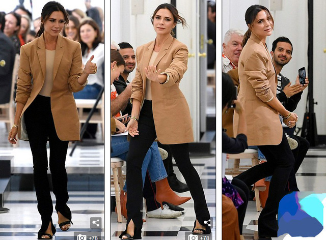 Cựu thành viên nhóm nhạc Spice Girl mặc chiếc áo blazer màu be, kết hợp với quần âu xẻ ống và đôi giày cao gót màu đen với phụ kiện đơn giản là chiếc mằt kiếng bản to và túi xách màu đỏ.