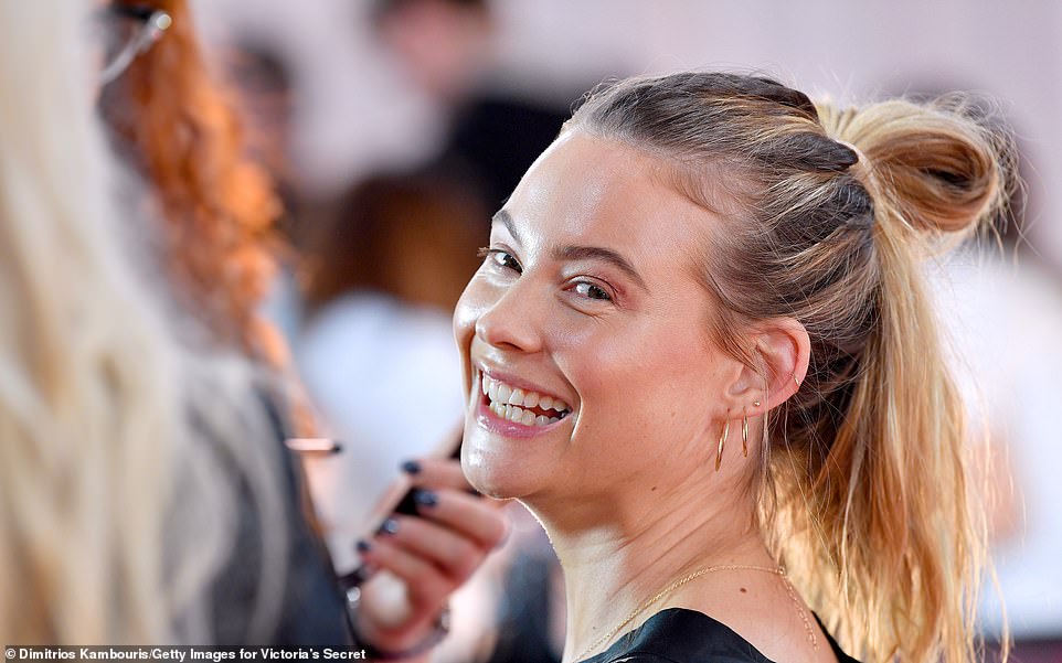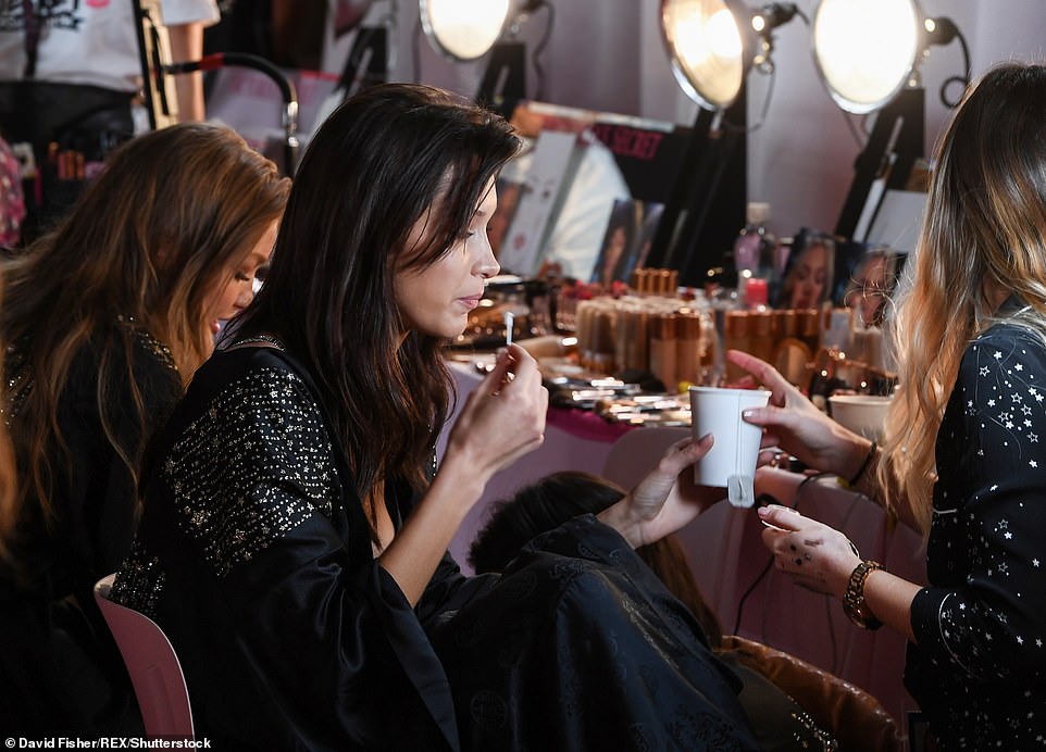Dàn thiên thần tinh nghịch kéo áo khoe vòng 3 siêu gợi cảm trước ống kính. Năm nay, thay vì áo choàng lụa hồng như cũ, các thiên thần mặc áo choàng đen đính pha lê lấp lánh trong hậu trường trang điểm, thay đồ.