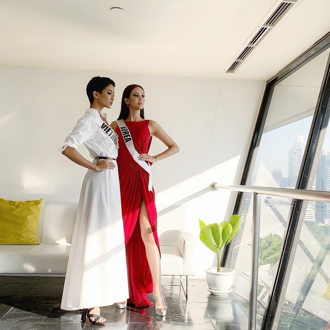 Cả hai thường có nhiều khoảnh khắc chụp ảnh, livestream chung và giúp đỡ nhau trong hậu trường. Khi về tới phòng hai người đẹp tỏ ra khá lầy lội.