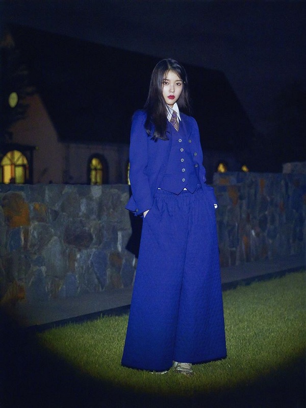 Gương mặt đại diện cho Gucci khu vực Hàn Quốc IU lạnh lùng trong bộ suit xanh dương sẫm cùng tone makeup đậm đà cá tính