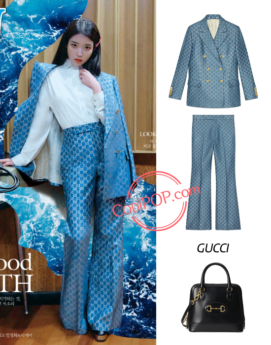IU cũng từng diện bộ cánh suit của Gucci khi chụp hình cho tạp chí W Korea, những dáng suit này giúp che đi khuyết điểm thân hình nhỏ con nhờ kiểu quần lưng cao ống rộng
