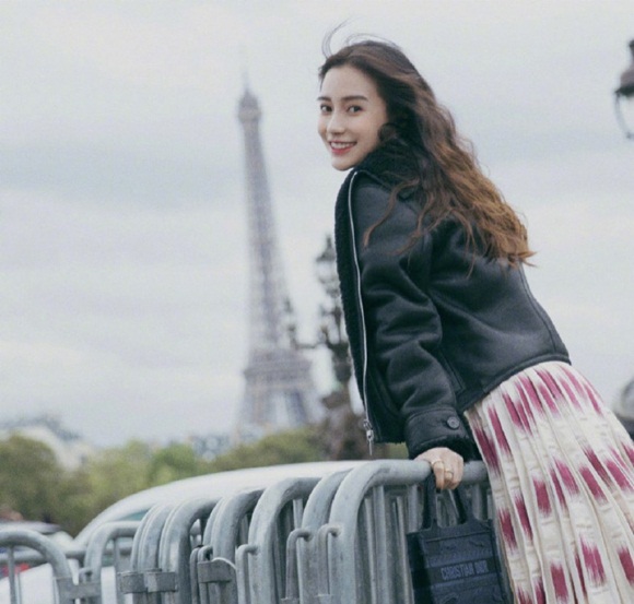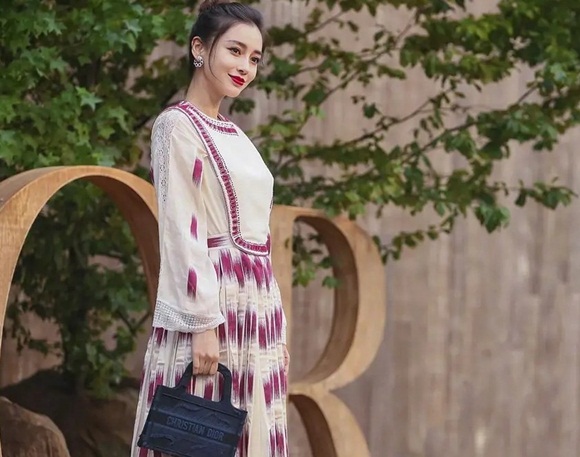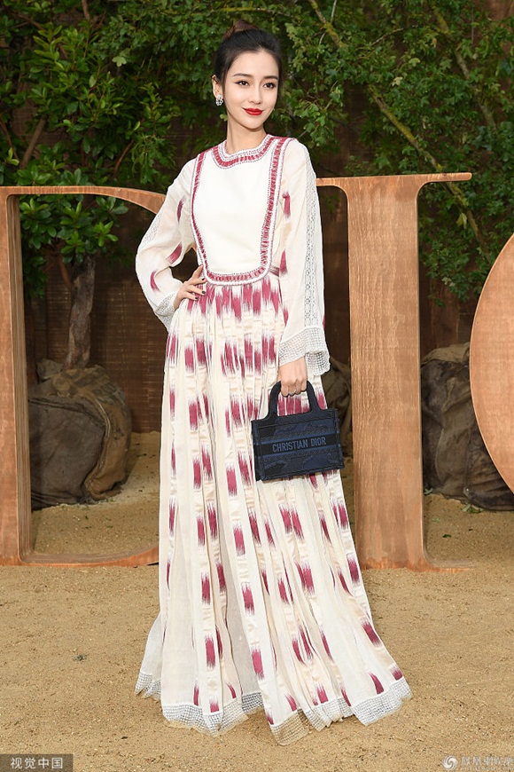 Trước đó hồi tháng 9, Angelababy mặc bộ váy họa tiết bồng xòe, kín đáo. Xuất hiện trước ống kính cô ghi điểm bởi thần thái khá sang trọng, tươi tắn cùng màu son đỏ chót làm bật lên nhan sắc kiêu sa