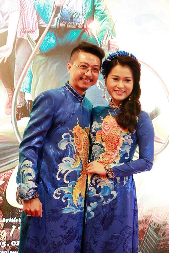 Lần khác, cả hai vợ chồng cùng diện tà áo dài xanh, mang họa tiết cá chép.