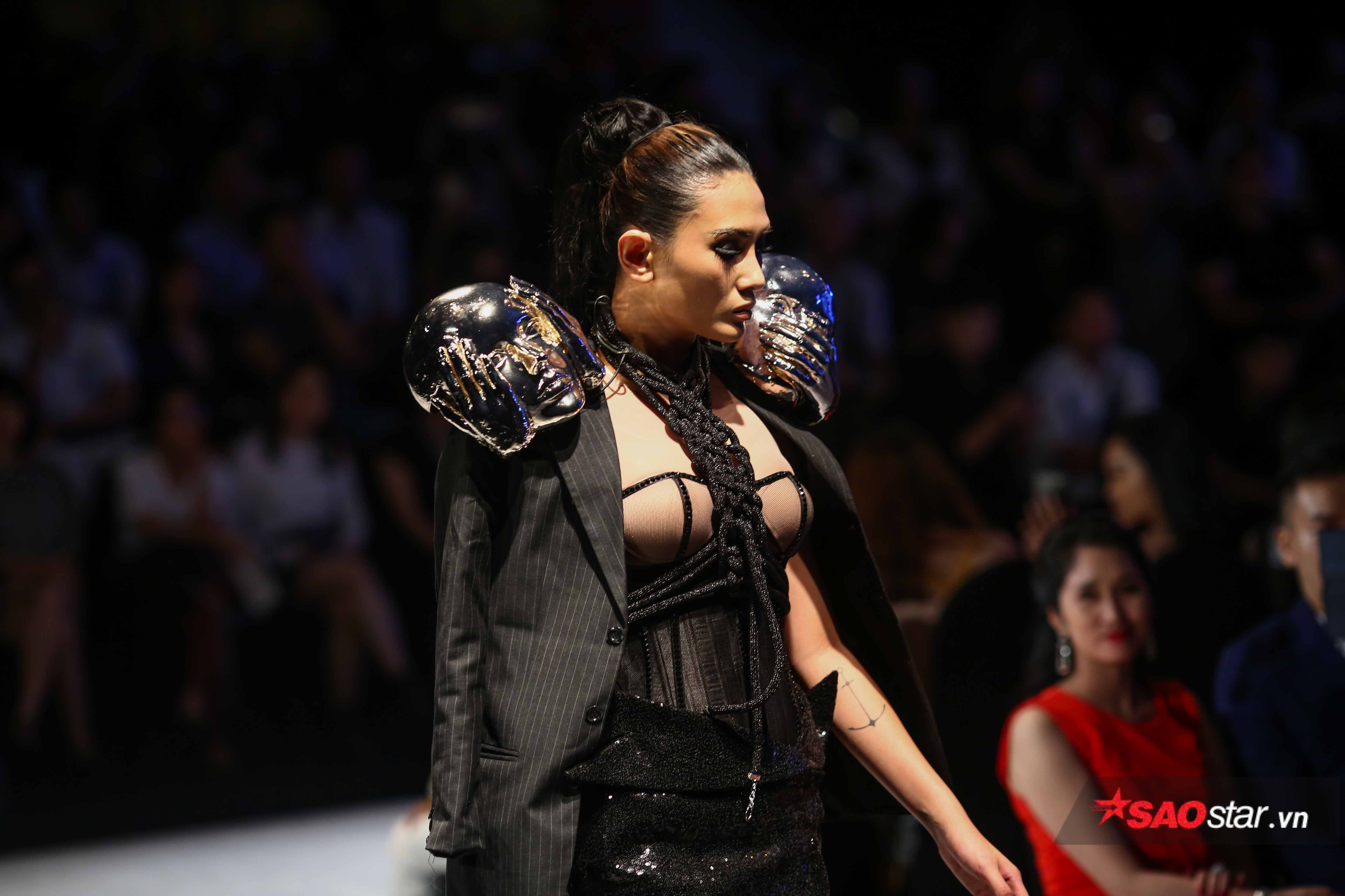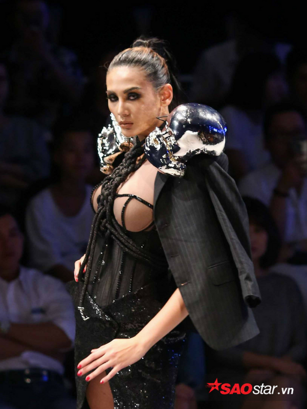 Không chỉ vậy, trang phục cô trình diễn còn gây chú ý khi có sự đính kết hai mô hình đầu người trên vai với 2 trạng thái cảm xúc khác nhau.