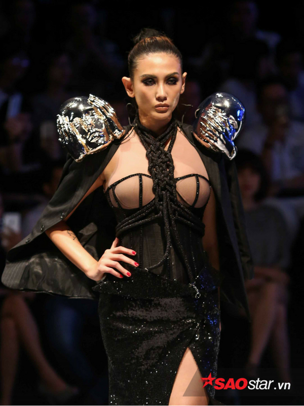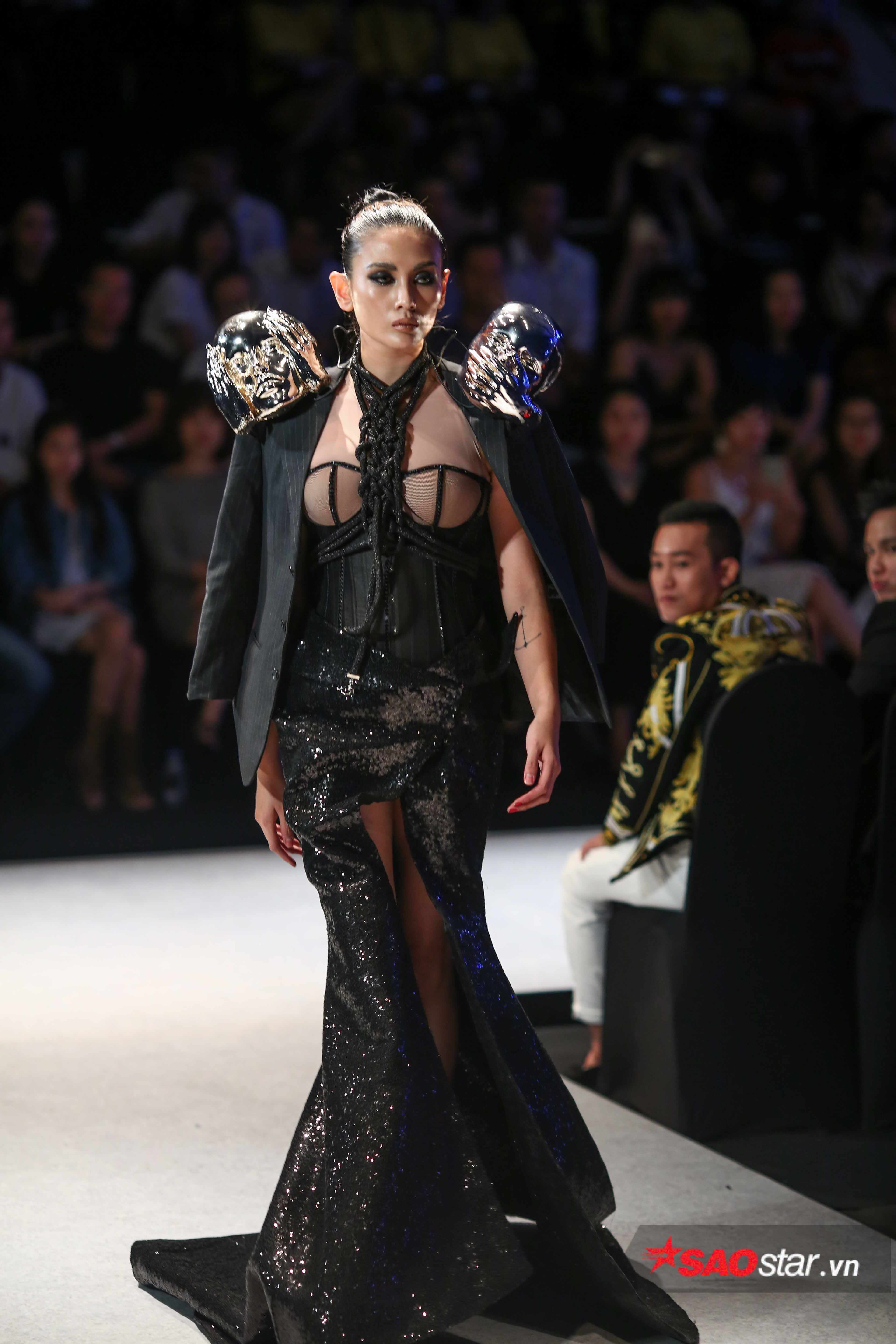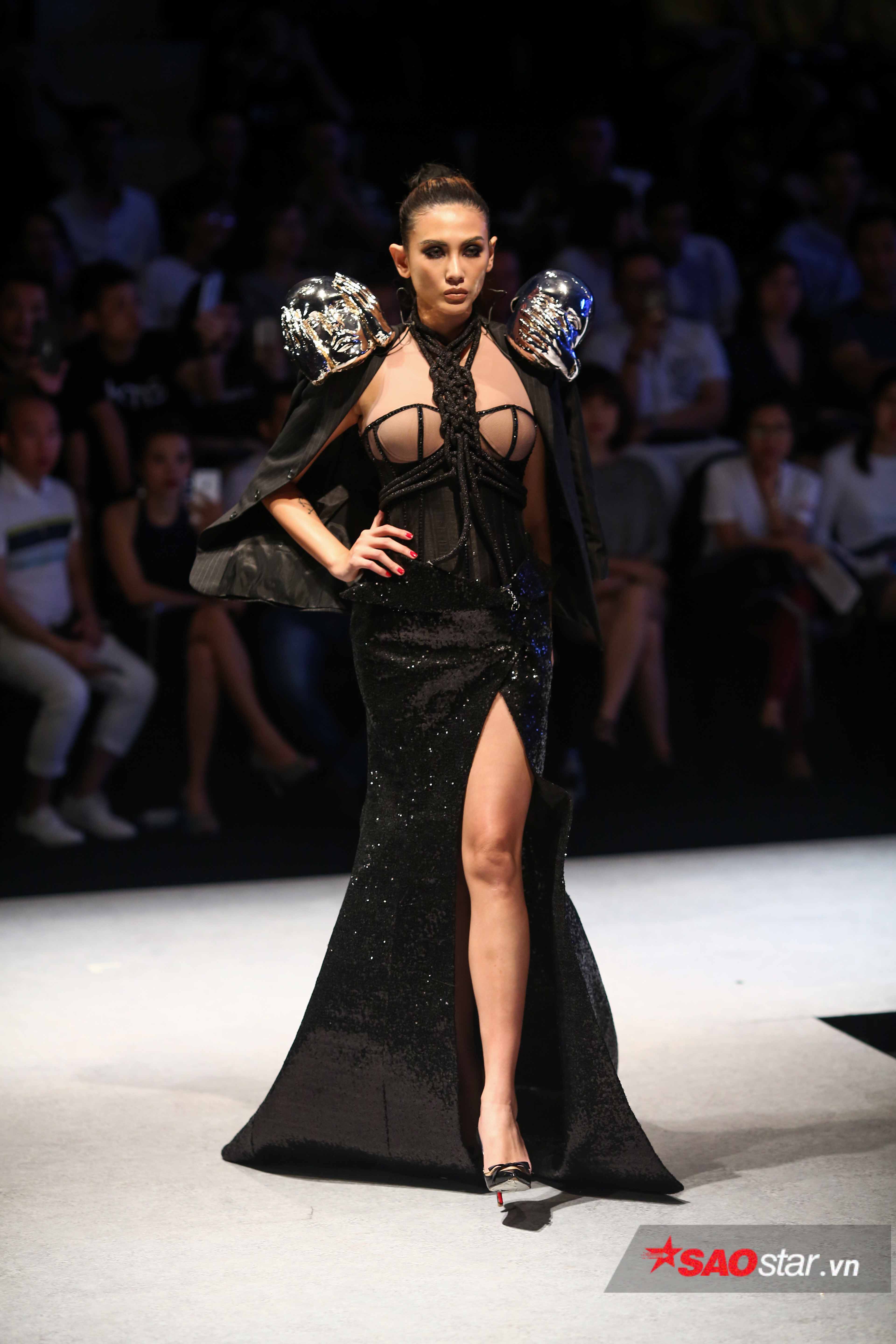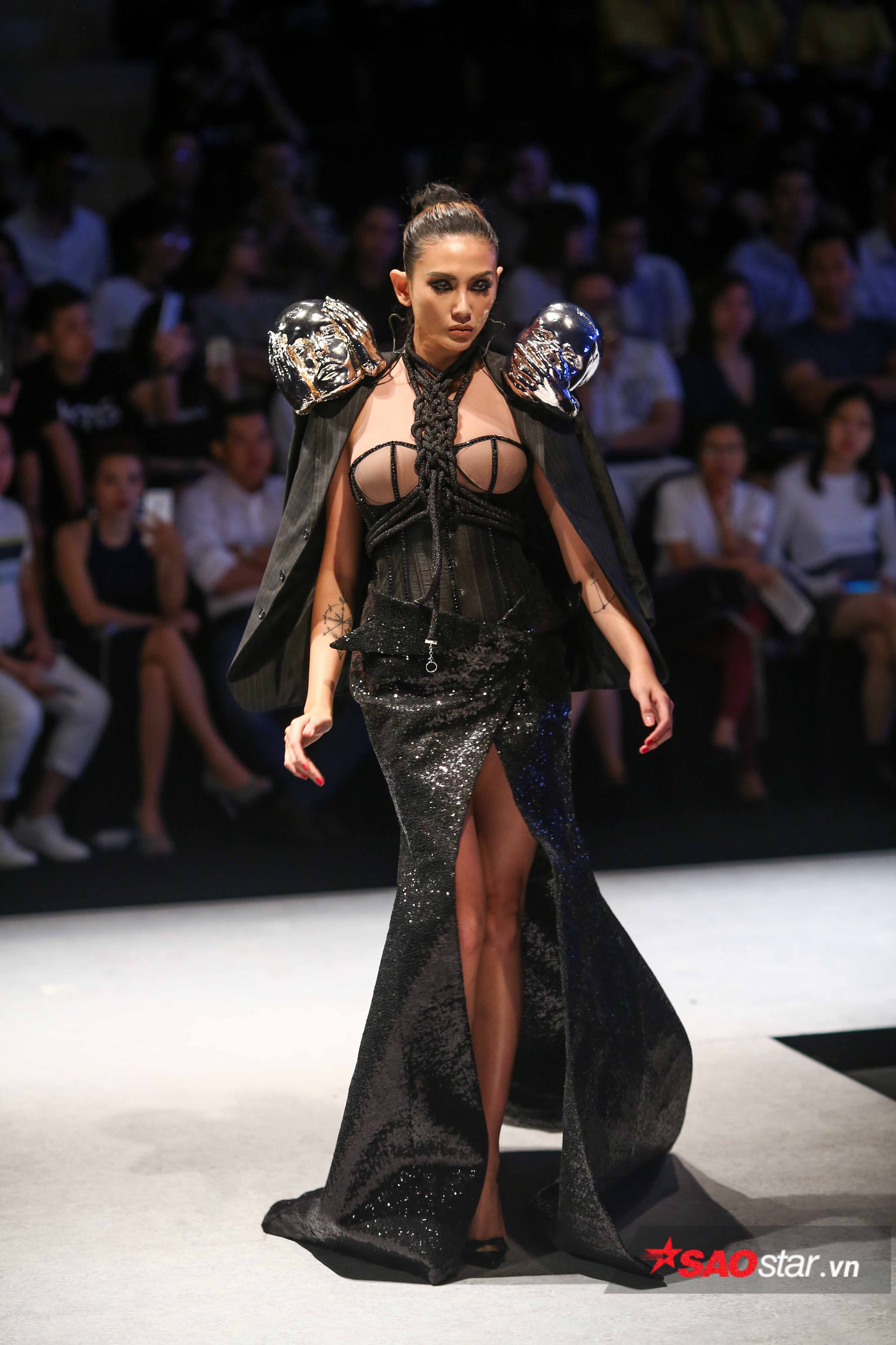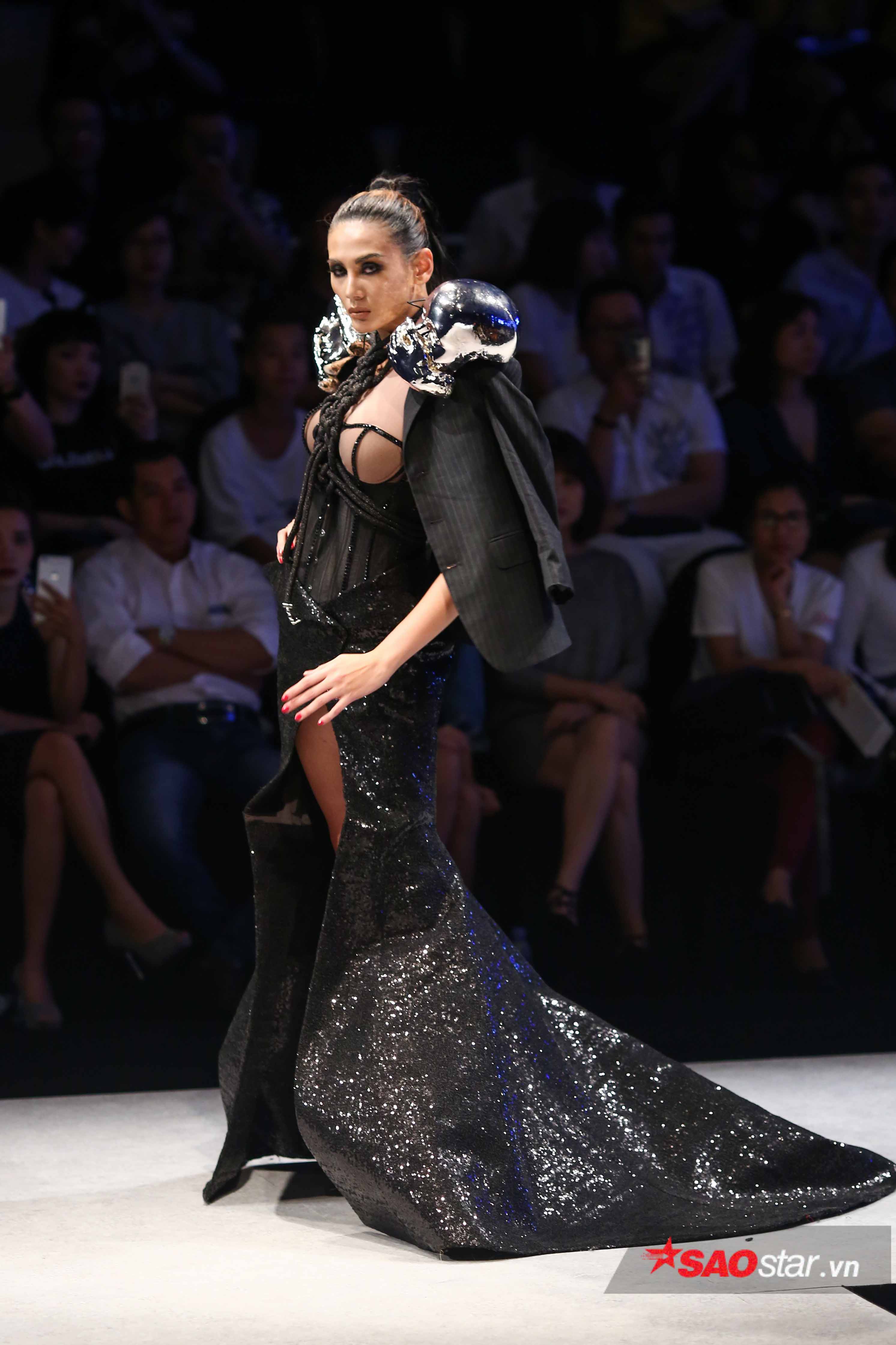 Thiết kế đặc biệt của Nguyễn Tiến Truyển với gam màu đen bí ẩn. Đường xẻ sâu táo bạo giúp khoe được đôi chân dài miên man của người mặc, cùng với đó, phần ngực ôm sát với gam màu nude khiến đường cong vòng một càng gợi cảm gấp bội.