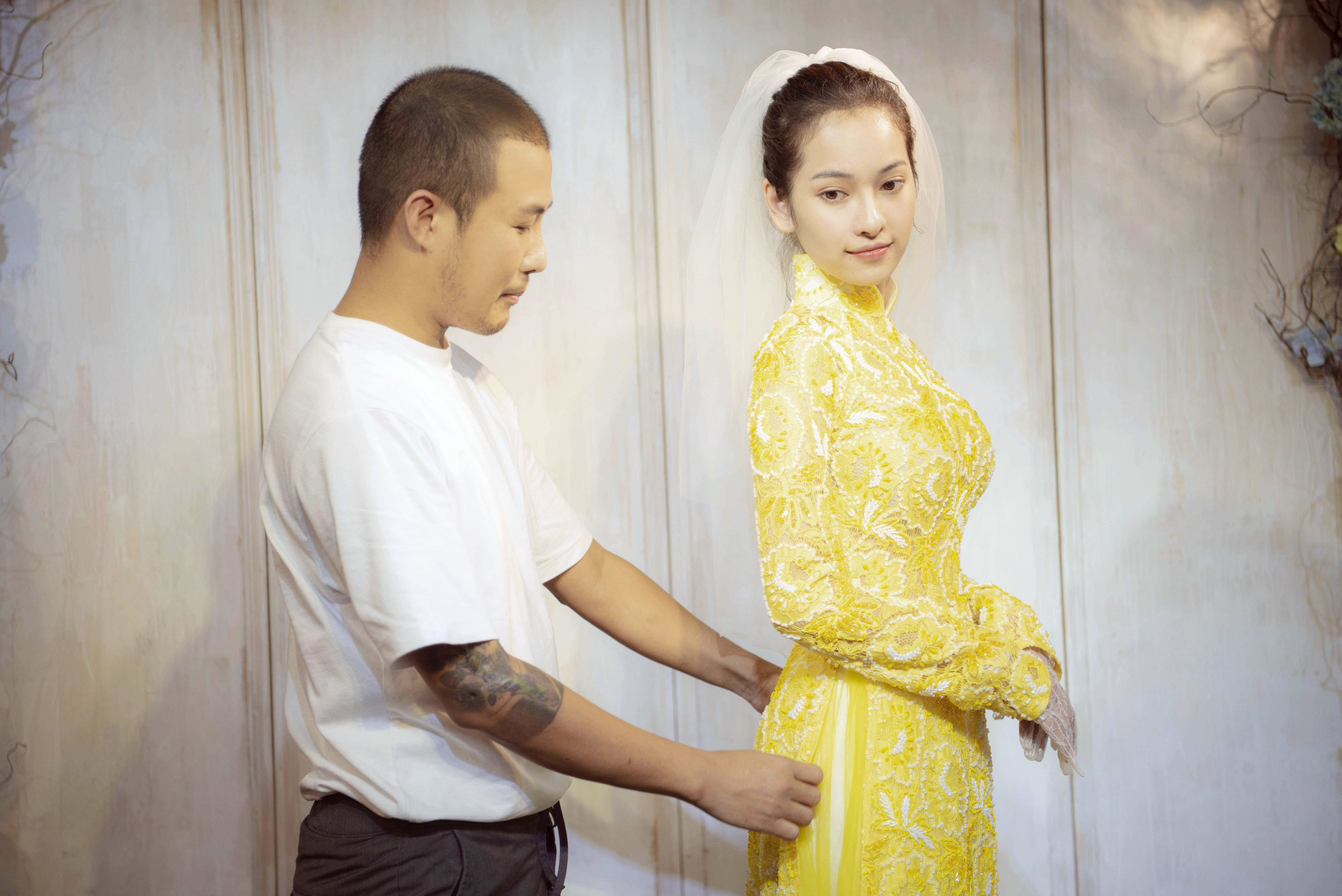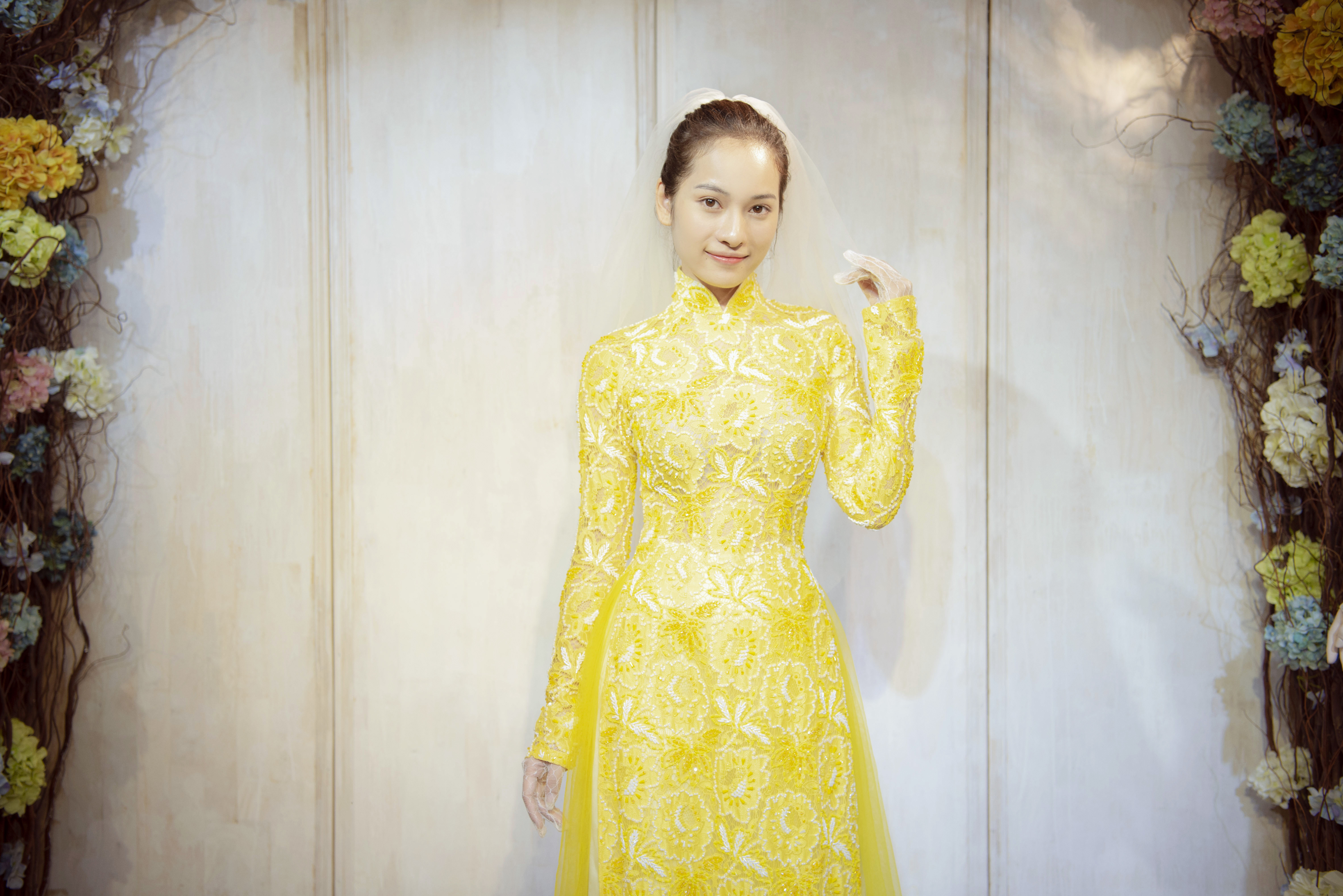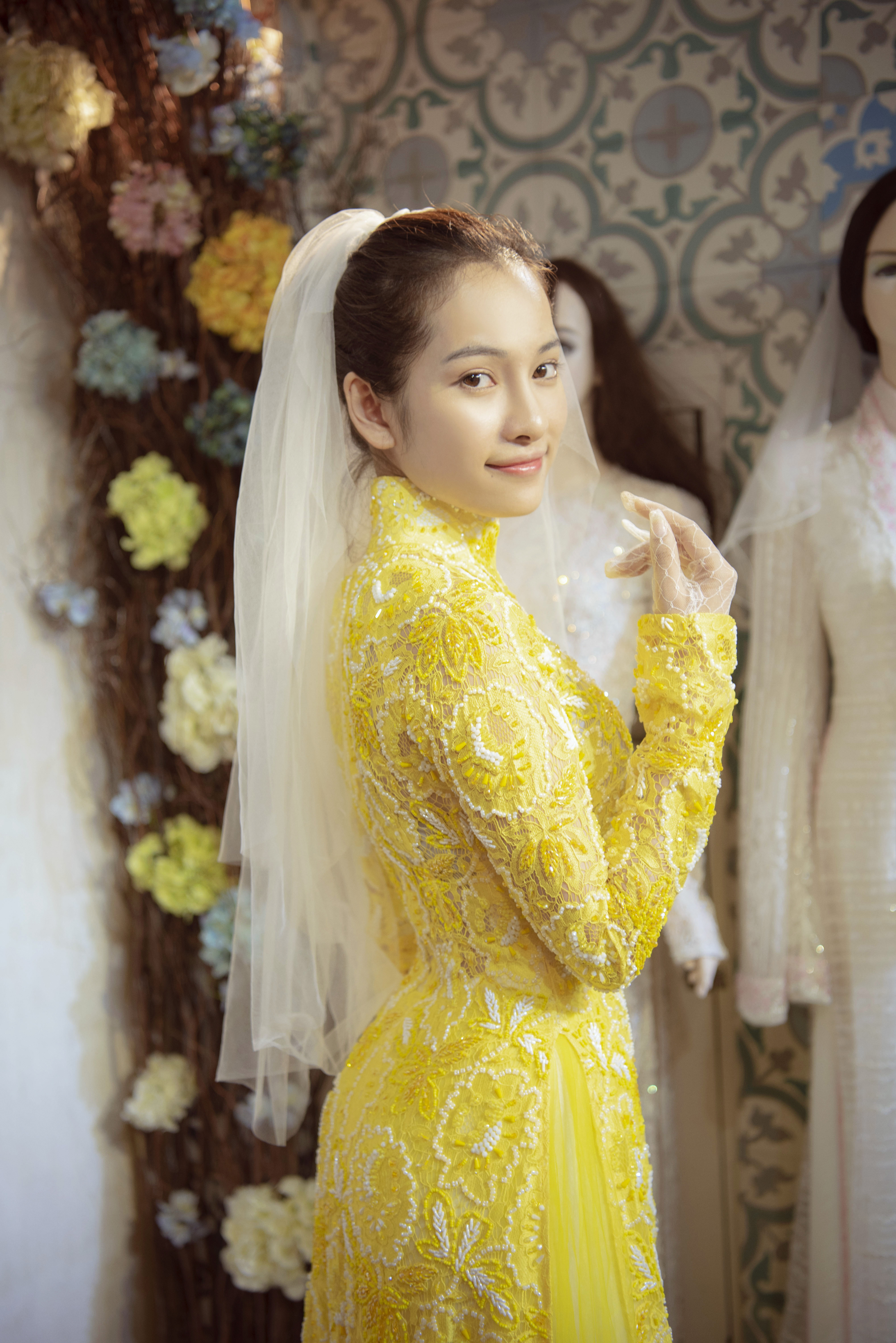 Sau đó, cô nàng tiếp tục thử mẫu áo dài cưới với tông màu vàng rực rỡ, phối cùng các hạt cườm trắng càng làm mọi thứ thêm phần nổi bật.