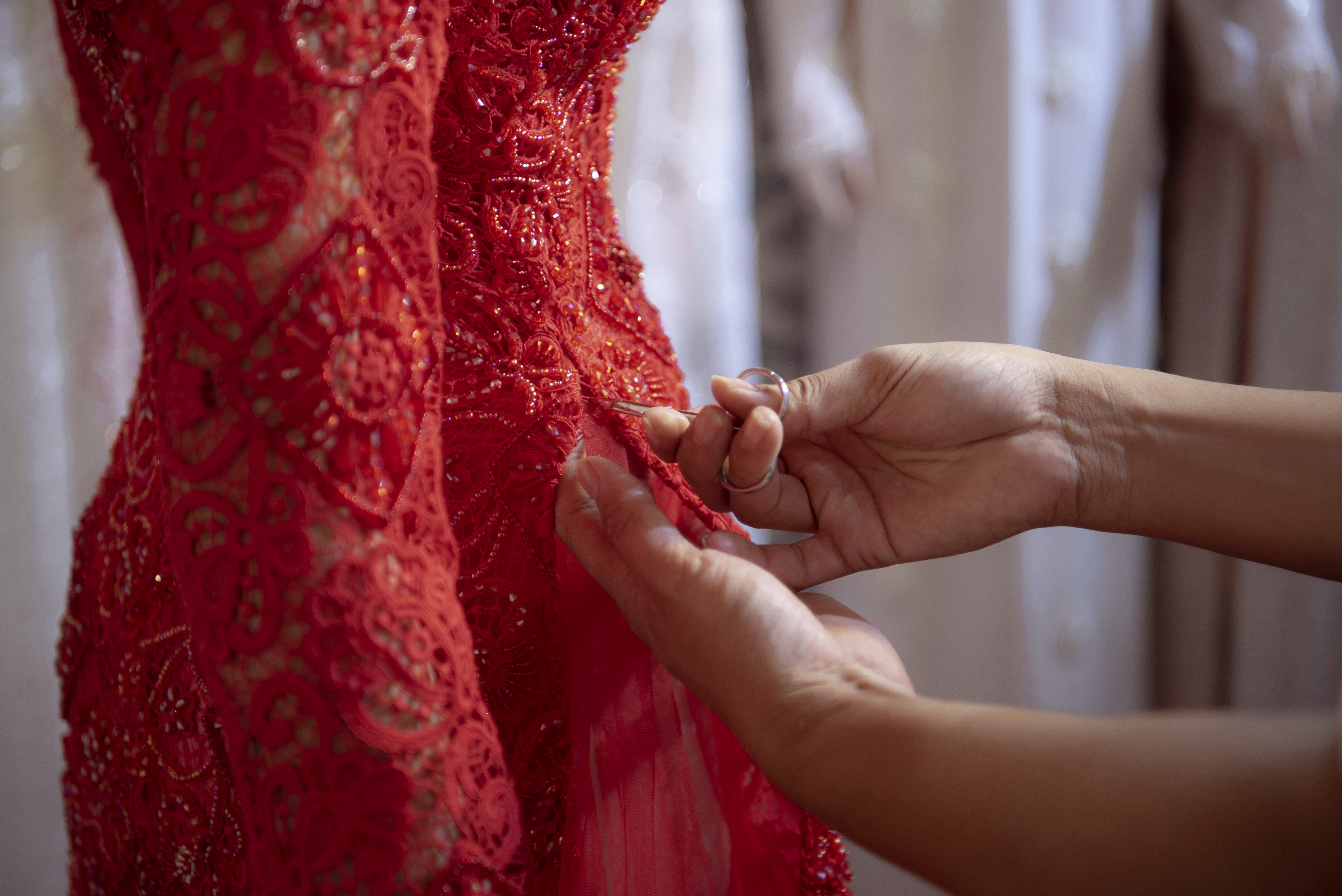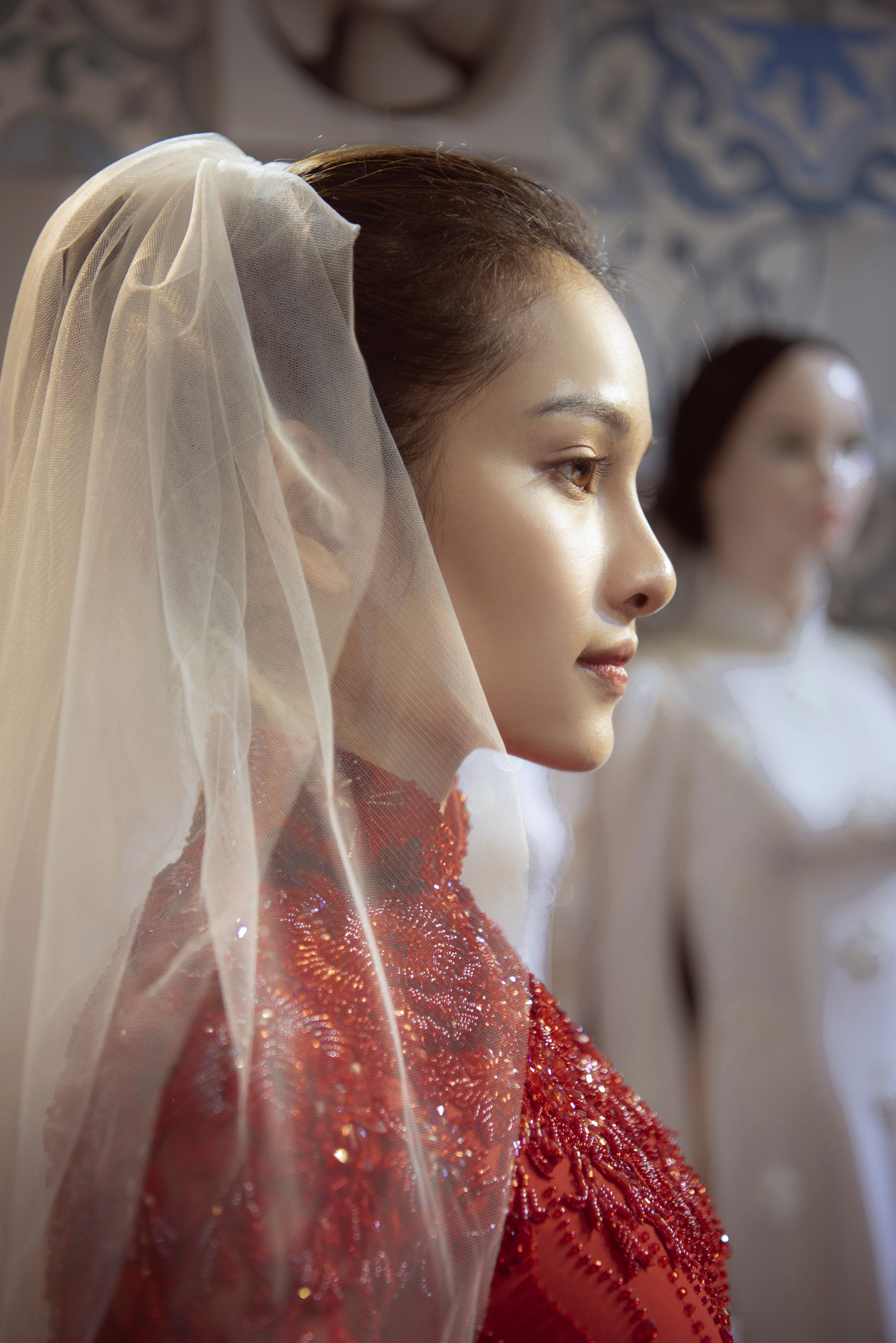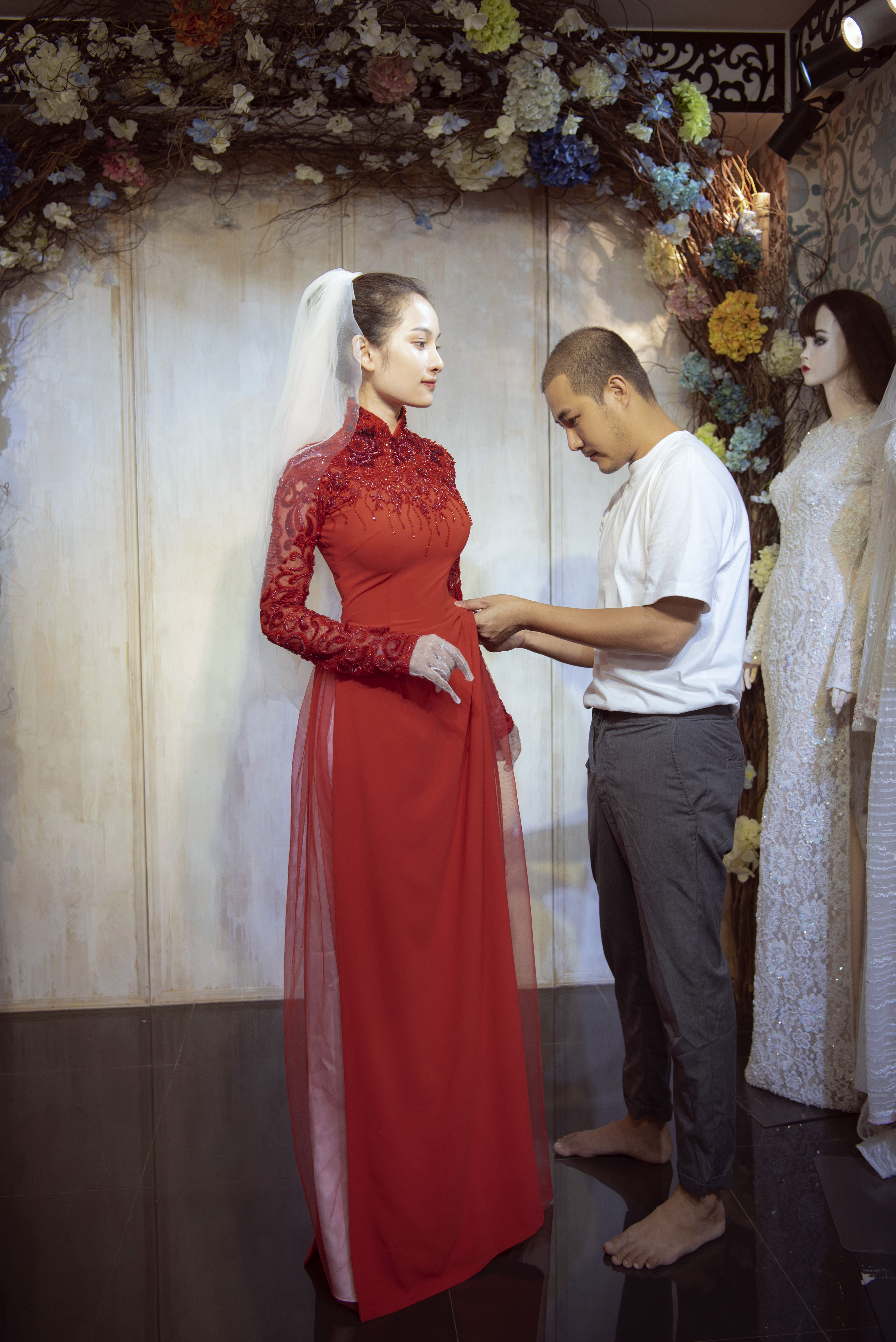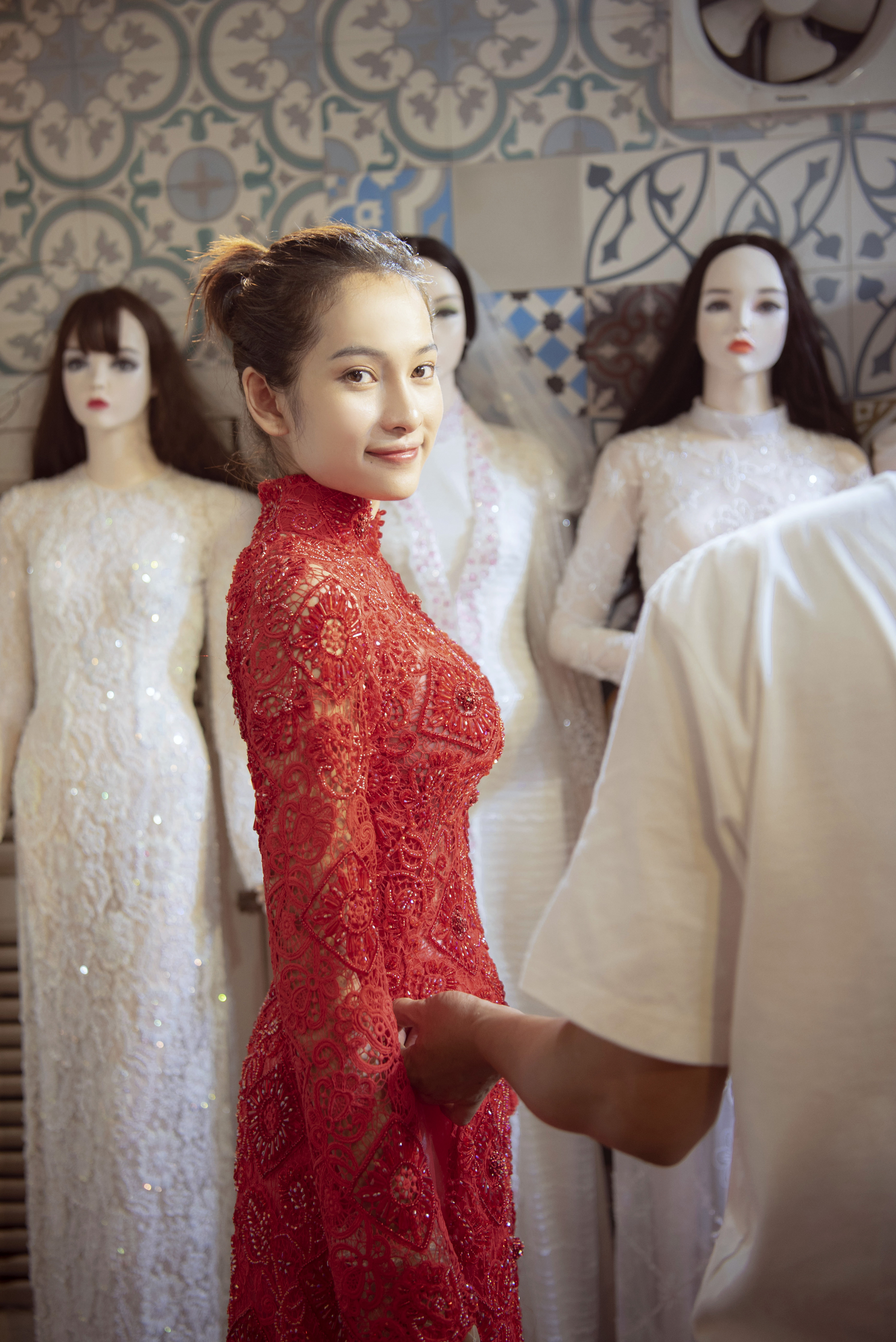 Thiết kế cuối cùng mà cô thử là tà áo dài màu đỏ sắt son, các hạt cườm đá được đính trên nền ren nổi tạo nên hiệu ứng lấp lánh.